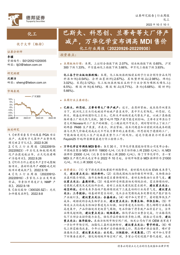 本报告的核心观点是:2022年9月26日至9月30日,化工板块整体表现弱于大市,主要受欧洲化工巨头减产、成本高企以及下游需求疲软等因素影响。但部分细分领域,如MDI、TDI价格上涨,以及部分化工产品在特定下游领域的景气度提升,展现出一定的增长潜力。报告建议关注光伏级EVA、生物柴油、硅基材料、合成生物学等高成长性细分赛道龙头企业。