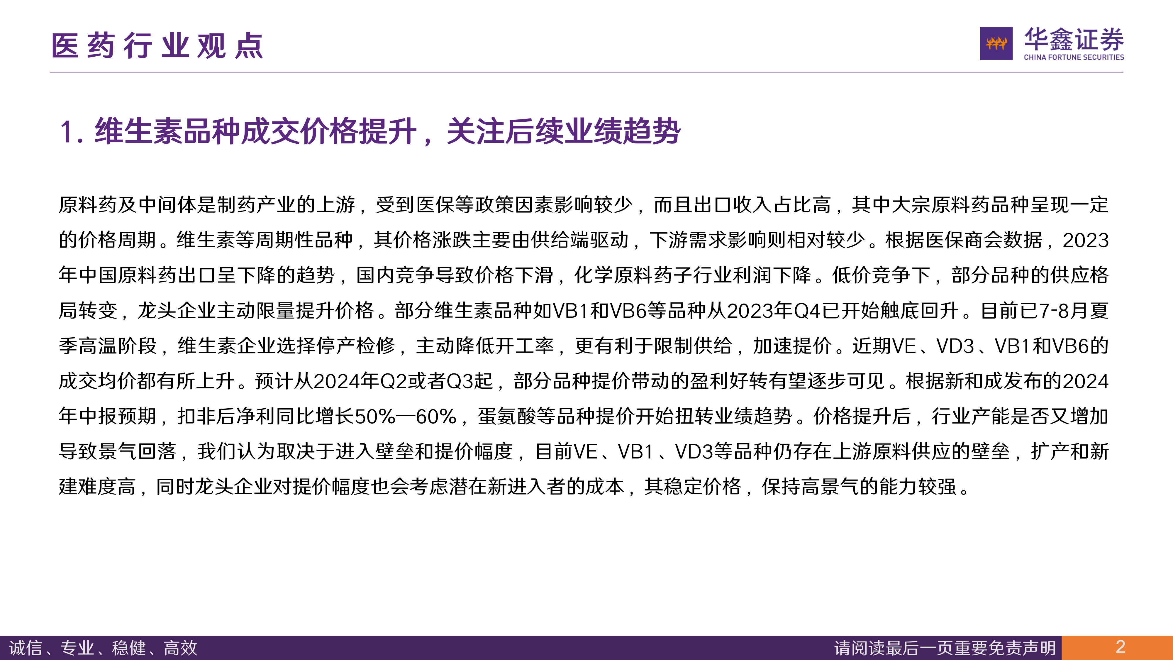 原料药及中间体是制药产业的上游, 受到医保等政策因素影响较少, 而且出口收入占比高, 其中大宗原料药品种呈现一定的价格周期。 维生素等周期性品种, 其价格涨跌主要由供给端驱动, 下游需求影响则相对较少。 根据医保商会数据, 2023年中国原料药出口呈下降的趋势, 国内竞争导致价格下滑, 化学原料药子行业利润下降。 低价竞争下, 部分品种的供应格局转变, 龙头企业主动限量提升价格。 部分维生素品种如VB1和VB6等品种从2023年Q4已开始触底回升。 目前已7-8月夏季高温阶段, 维生素企业选择停产检修, 主动降低开工率, 更有利于限制供给, 加速提价。 近期VE、 VD3、 VB1和VB6的成交均价都有所上升。 预计从2024年Q2或者Q3起, 部分品种提价带动的盈利好转有望逐步可见。 根据新和成发布的2024年中报预期, 扣非后净利同比增长50%—60%, 蛋氨酸等品种提价开始扭转业绩趋势。 价格提升后, 行业产能是否又增加导致景气回落, 我们认为取决于进入壁垒和提价幅度, 目前VE、 VB1、 VD3等品种仍存在上游原料供应的壁垒, 扩产和新建难度高, 同时龙头企业对提价幅度也会考虑潜在新进入者的成本, 其稳定价格, 保持高景气的能力较强。