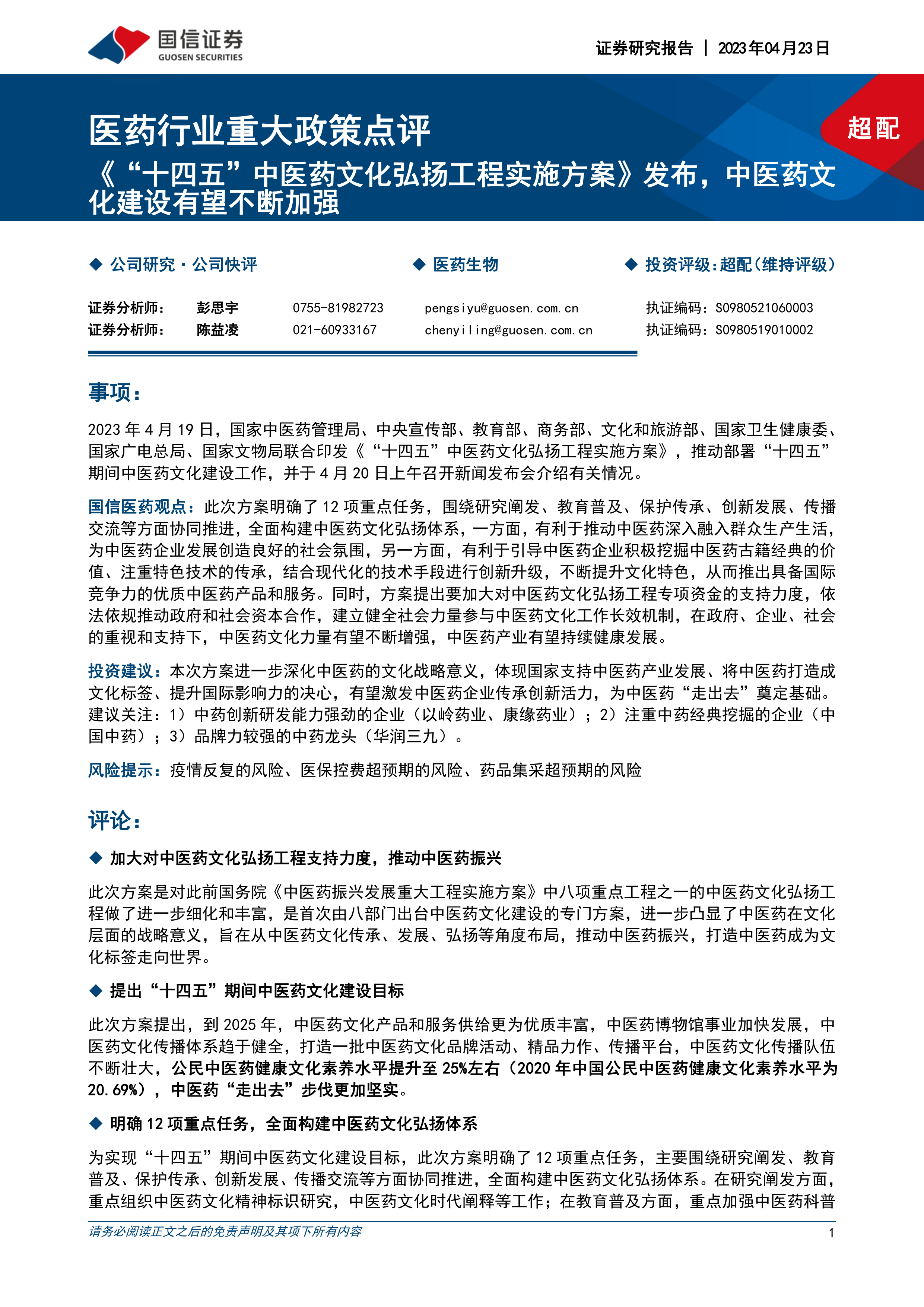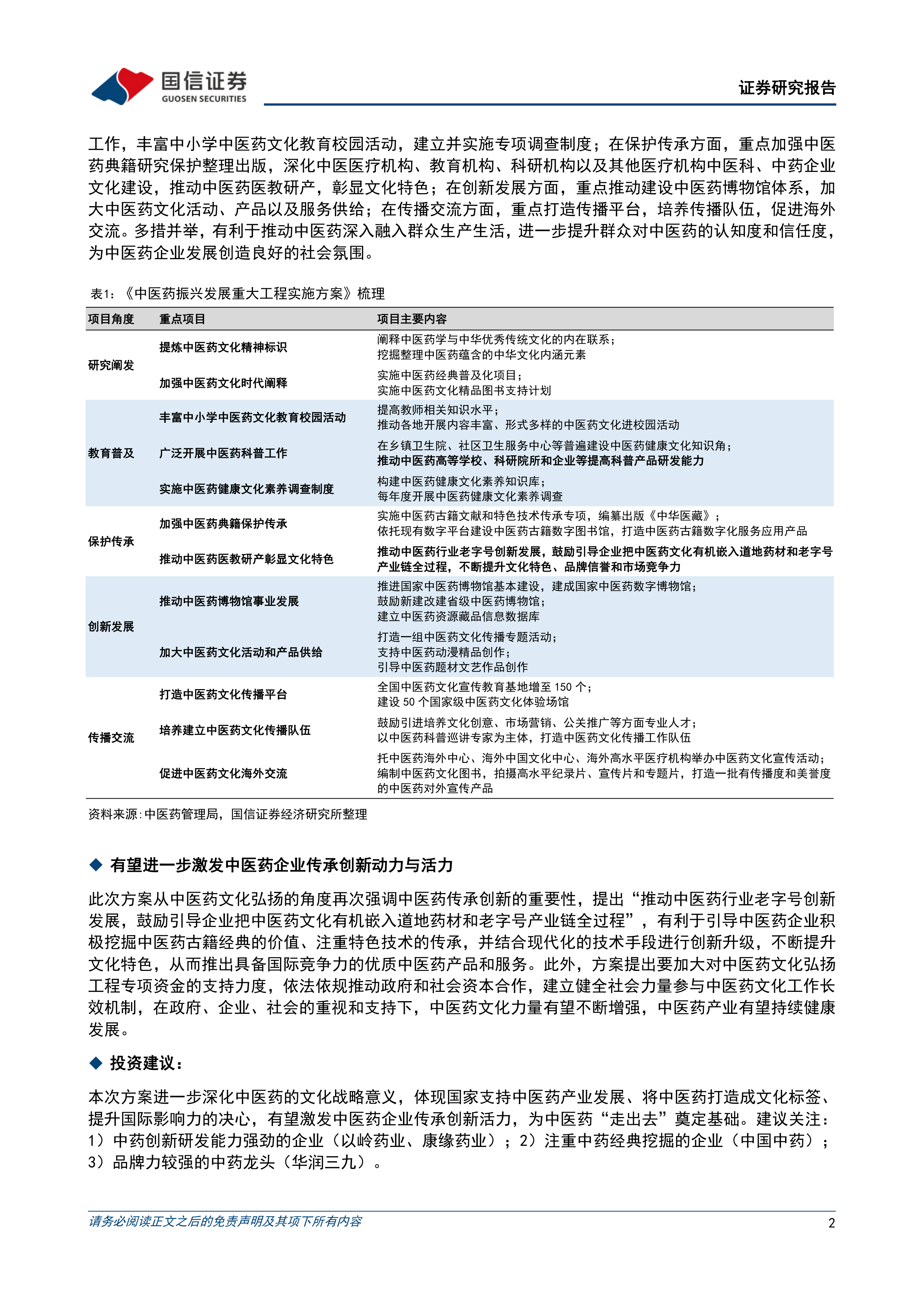 本报告的核心观点是:国家发布的《“十四五”中医药文化弘扬工程实施方案》对中医药产业发展具有重大意义。该方案明确了12项重点任务,旨在全面构建中医药文化弘扬体系,推动中医药深入融入群众生产生活,提升中医药的国际影响力,并为中医药企业创造良好的发展环境。 这将进一步激发中医药企业的传承创新活力,促进中医药产业持续健康发展。 报告建议关注具备中药创新研发能力、注重中药经典挖掘以及品牌力较强的中药企业。