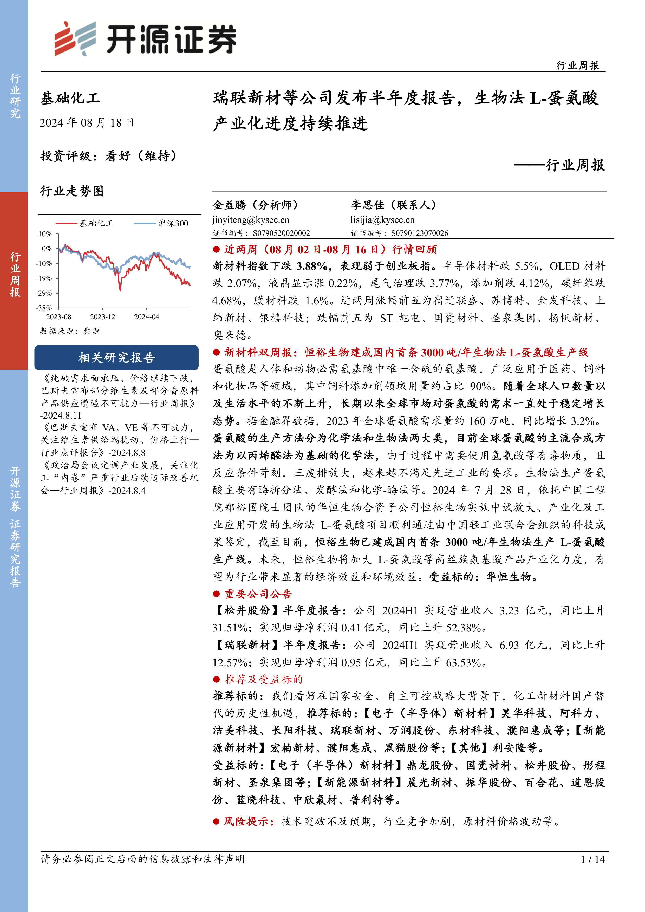 基础化工行业周报:瑞联新材等公司发布半年度报告,生物法L-蛋氨酸产业化进度持续推进