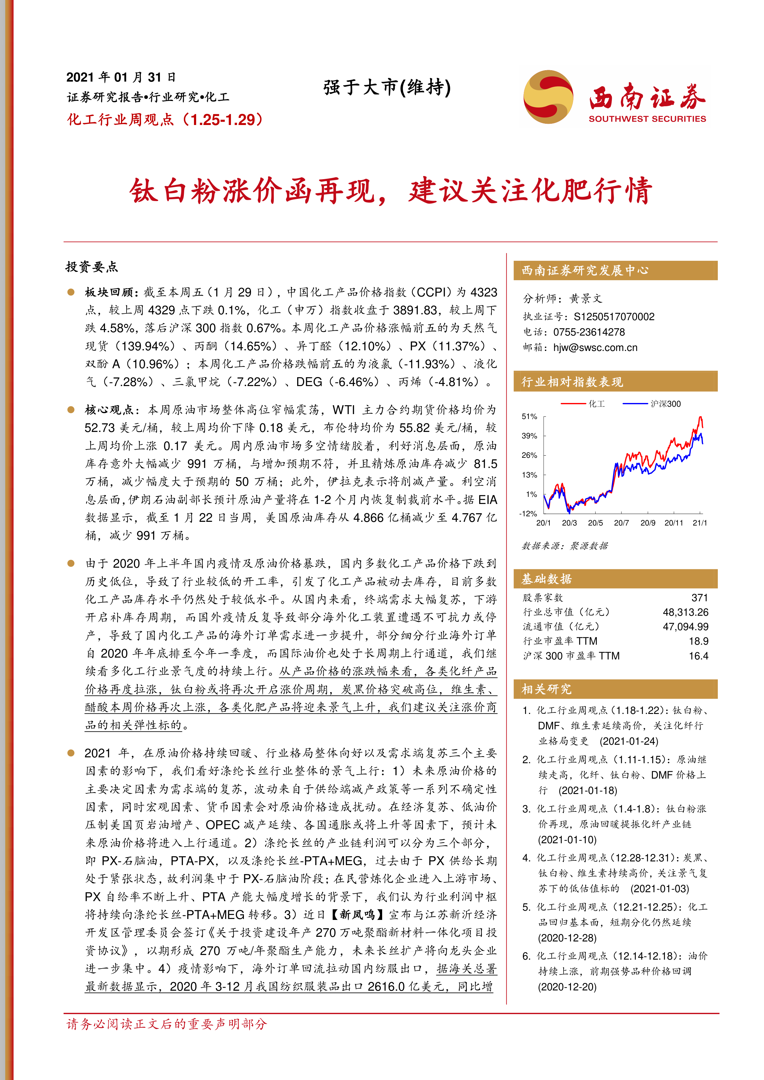 本报告基于对化工行业近期市场表现的全面分析,认为化工行业景气度持续上行。 原油价格回暖、国内外需求复苏、行业格局优化以及部分产品涨价潮是推动行业景气度上行的主要因素。 报告对多个化工子板块进行了深入分析,并推荐了部分具备高成长性的化工企业,为投资者提供了有价值的参考信息。 然而,投资者仍需关注大宗产品价格下滑、原油价格大幅波动以及下游需求不及预期等风险。 报告最后还提供了分析师承诺和重要声明,以确保信息的透明度和合规性。