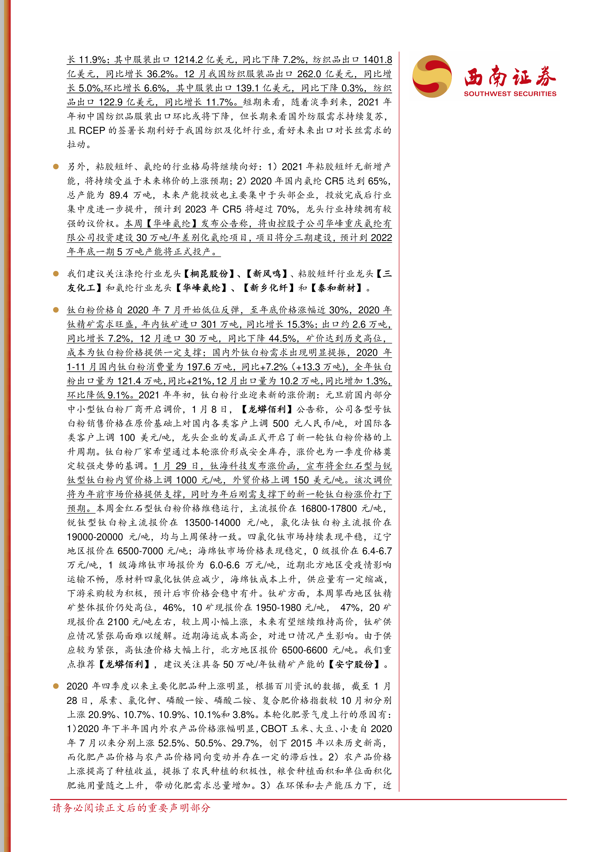 钛白粉价格自2020年7月开始低位反弹,至年底价格涨幅近30%,2020年钛精矿需求旺盛,年内钛矿进口301万吨,同比增长15.3%;出口约2.6万吨,同比增长7.2%,12月进口30万吨,同比下降44.5%,矿价达到历史高位,成本为钛白粉价格提供一定支撑;国内外钛白粉需求出现明显提振,2020年1-11月国内钛白粉消费量为197.6万吨,同比+7.2%(+13.3万吨),全年钛白粉出口量为121.4万吨,同比+21%,12月出口量为10.2万吨,同比增加1.3%,环比降低9.1%。2021年年初,钛白粉行业迎来新的涨价潮:元旦前国内部分中小型钛白粉厂商开启调价,1月8日,【龙蟒佰利】公告称,公司各型号钛白粉销售价格在原价基础上对国内各类客户上调500元人民币/吨,对国际各类客户上调100美元/吨,龙头企业的发函正式开启了新一轮钛白粉价格的上升周期。钛白粉厂家希望通过本轮涨价形成安全库存,涨价也为一季度价格奠定较强走势的基调。1月29日,钛海科技发布涨价函,宣布将金红石型与锐钛型钛白粉内贸价格上调1000元/吨,外贸价格上调150美元/吨。该次调价将为年前市场价格提供支撑,同时为年后刚需支撑下的新一轮钛白粉涨价打下预期。本周金红石型钛白粉价格维稳运行,主流报价在16800-17800元/吨,锐钛型钛白粉主流报价在13500-14000元/吨,氯化法钛白粉主流报价在19000-20000元/吨,均与上周保持一致。四氯化钛市场持续表现平稳,辽宁地区报价在6500-7000元/吨;海绵钛市场价格表现稳定,0级报价在6.4-6.7万元/吨,1级海绵钛市场报价为6.0-6.6万元/吨,近期北方地区受疫情影响运输不畅,原材料四氯化钛供应减少,海绵钛成本上升,供应量有一定缩减,下游采购较为积极,预计后市价格会稳中有升。钛矿方面,本周攀西地区钛精矿整体报价仍处高位,46%,10矿现报价在1950-1980元/吨,47%,20矿现报价在2100元/吨左右,较上周小幅上涨,未来有望继续维持高价,钛矿供应情况紧张局面难以缓解。近期海运成本高企,对进口情况产生影响。由于供应较为紧张,高钛渣价格大幅上行,北方地区报价6500-6600元/吨。我们重点推荐【龙蟒佰利】,建议关注具备50万吨/年钛精矿产能的【安宁股份】。