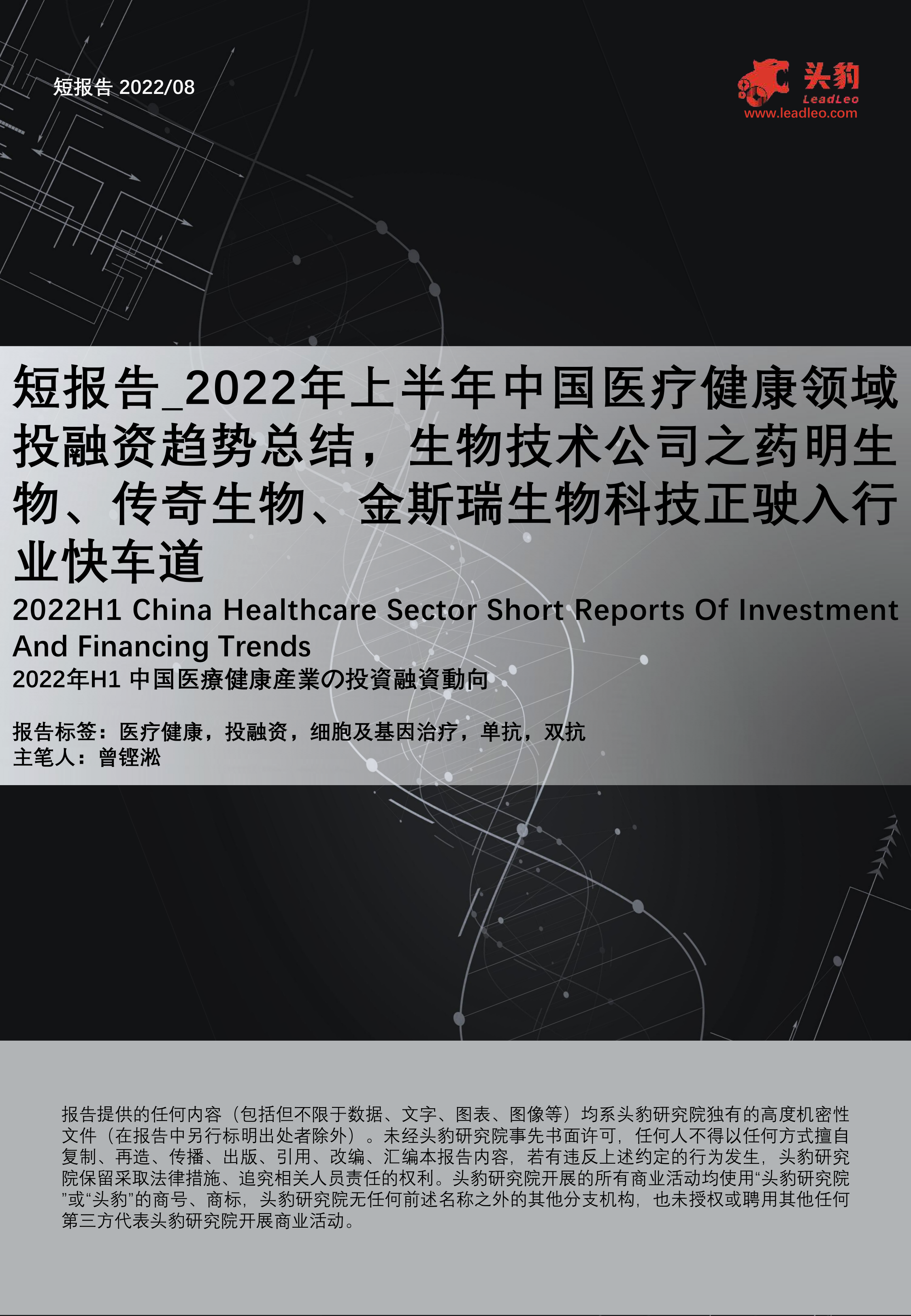 短报告_2022年上半年中国医疗健康领域投融资趋势总结,生物技术公司之药明生物、传奇生物、金斯瑞生物科技正驶入行业快车道
