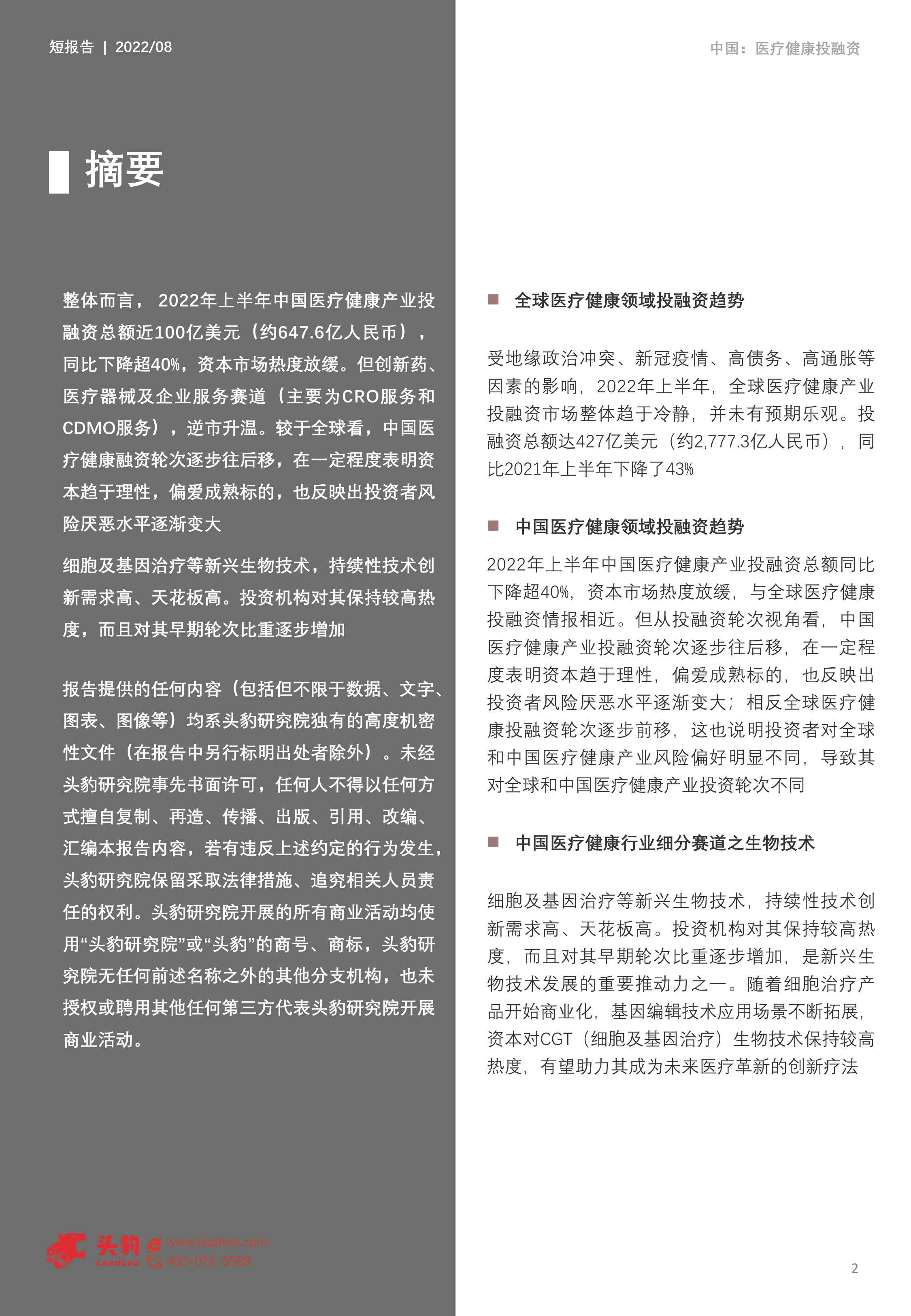 本报告基于头豹研究院数据,分析了2022年上半年中国医疗健康领域投融资趋势。核心观点如下: