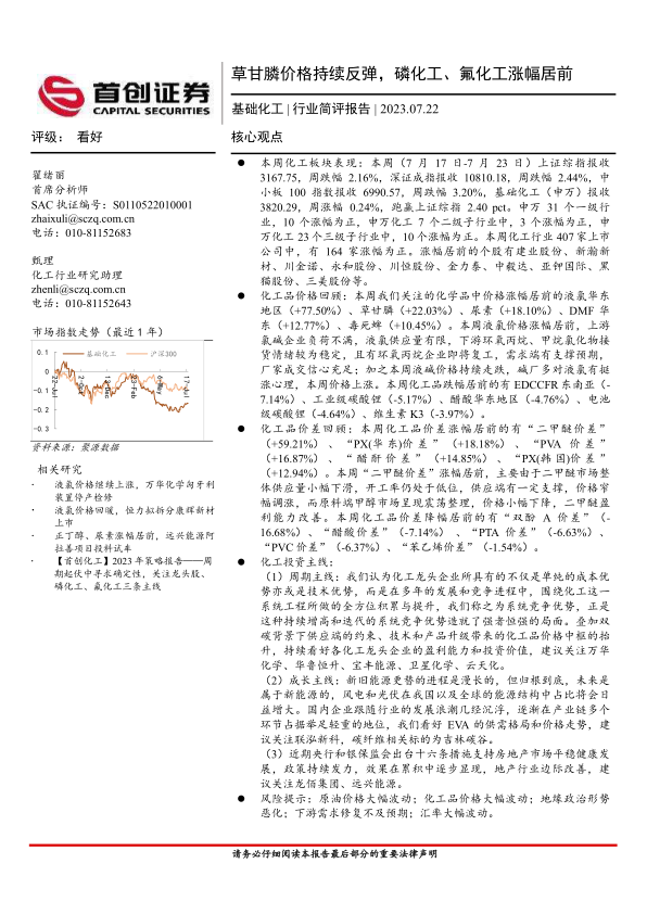 基础化工行业简评报告:草甘膦价格持续反弹,磷化工、氟化工涨幅居前