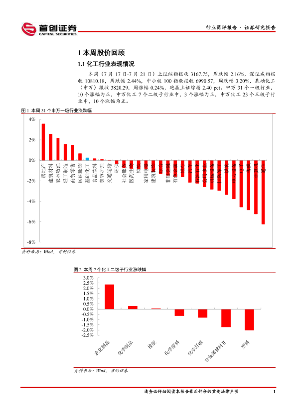 本周化工板块表现:本周(7月17日-7月23日)上证综指报收3167.75,周跌幅2.16%,深证成指报收10810.18,周跌幅2.44%,中小板100指数报收6990.57,周跌幅3.20%,基础化工(申万)报收3820.29,周涨幅0.24%,跑赢上证综指2.40pct。申万31个一级行业,10个涨幅为正,申万化工7个二级子行业中,3个涨幅为正,申万化工23个三级子行业中,10个涨幅为正。本周化工行业407家上市公司中,有164家涨幅为正。涨幅居前的个股有建业股份、新瀚新材、川金诺、永和股份、川恒股份、金力泰、中毅达、亚钾国际、黑猫股份、三美股份等。