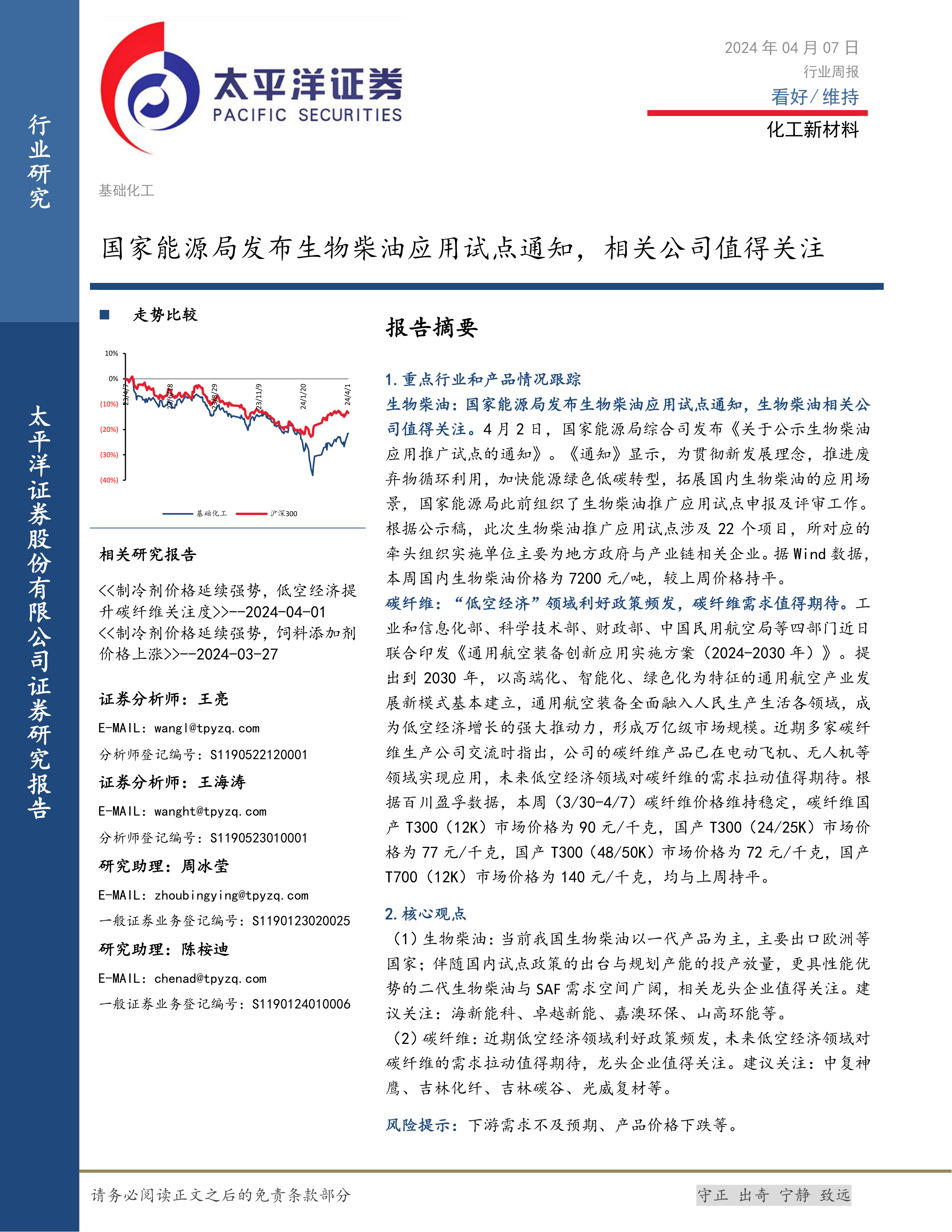 化工新材料行业周报:国家能源局发布生物柴油应用试点通知,相关公司值得关注