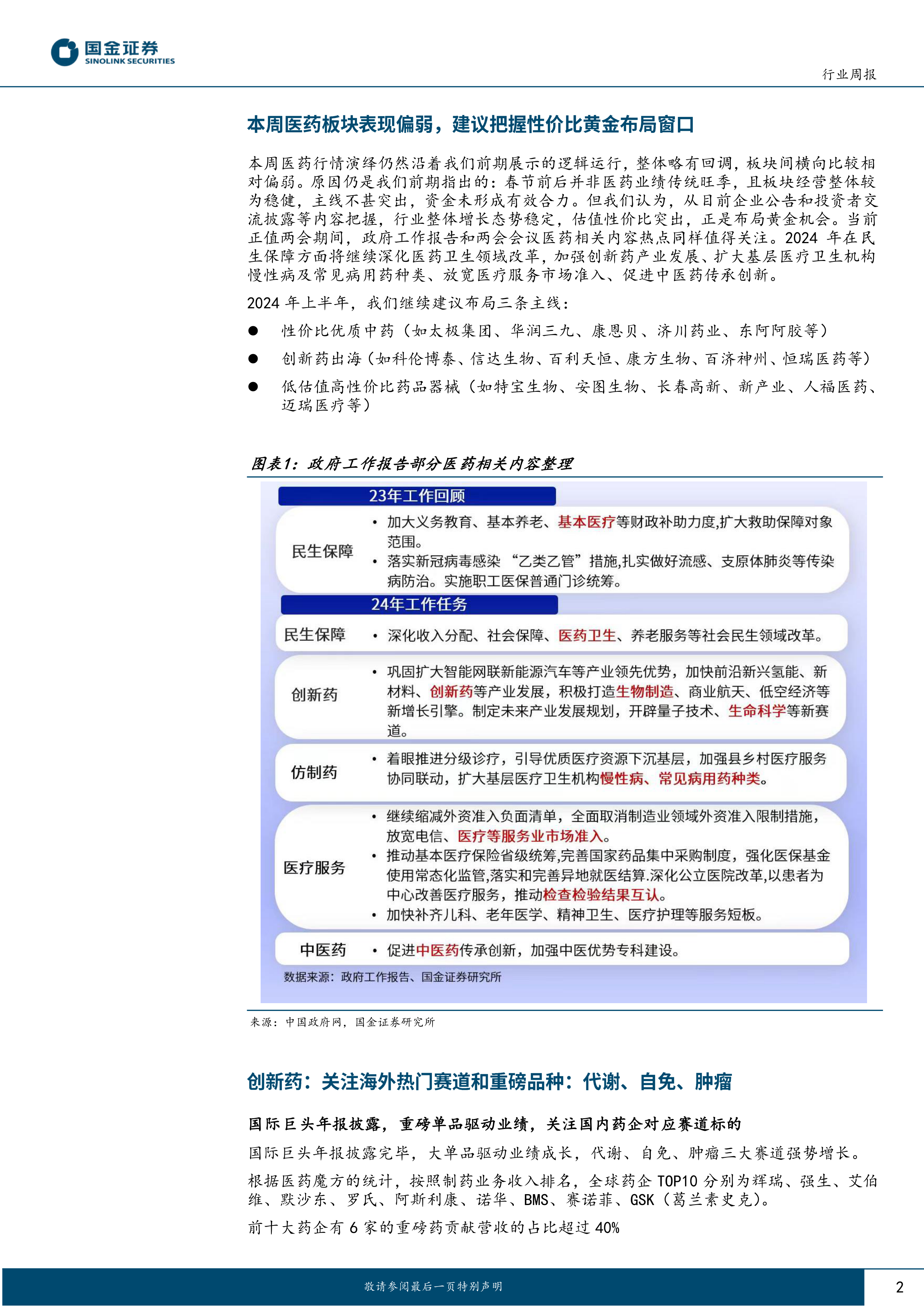 本周医药行情演绎仍然沿着我们前期展示的逻辑运行,整体略有回调,板块间横向比较相对偏弱。原因仍是我们前期指出的:春节前后并非医药业绩传统旺季,且板块经营整体较为稳健,主线不甚突出,资金未形成有效合力。但我们认为,从目前企业公告和投资者交流披露等内容把握,行业整体增长态势稳定,估值性价比突出,正是布局黄金机会。当前正值两会期间,政府工作报告和两会会议医药相关内容热点同样值得关注。 2024 年在民生保障方面将继续深化医药卫生领域改革,加强创新药产业发展、扩大基层医疗卫生机构慢性病及常见病用药种类、放宽医疗服务市场准入、促进中医药传承创新。
