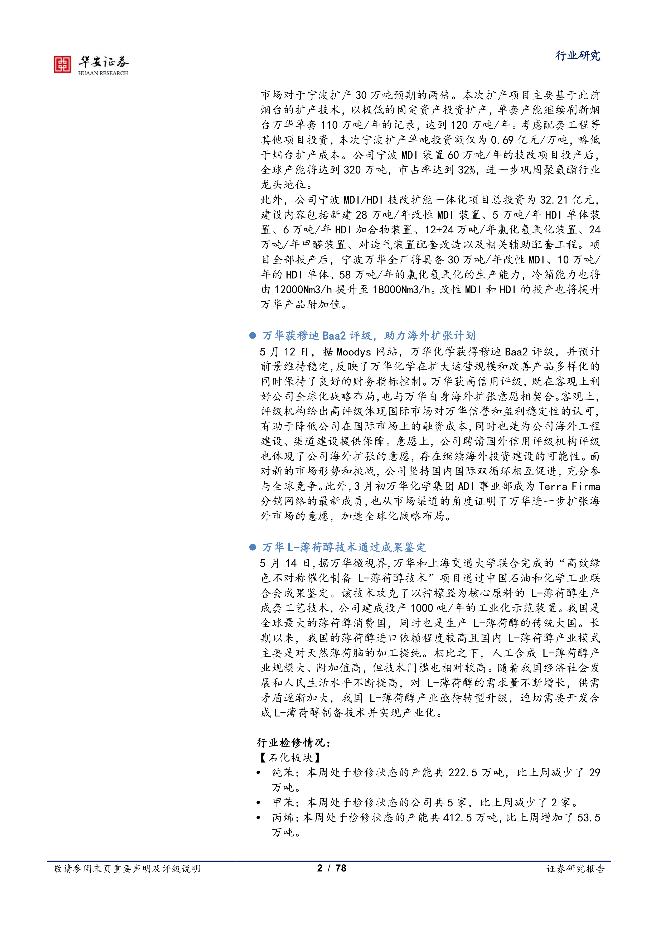 5月12日,据Moodys网站,万华化学获得穆迪Baa2评级,并预计前景维持稳定,反映了万华化学在扩大运营规模和改善产品多样化的同时保持了良好的财务指标控制。万华获高信用评级,既在客观上利好公司全球化战略布局,也与万华自身海外扩张意愿相契合。客观上,评级机构给出高评级体现国际市场对万华信誉和盈利稳定性的认可,有助于降低公司在国际市场上的融资成本,同时也是为公司海外工程建设、渠道建设提供保障。意愿上,公司聘请国外信用评级机构评级也体现了公司海外扩张的意愿,存在继续海外投资建设的可能性。面对新的市场形势和挑战,公司坚持国内国际双循环相互促进,充分参与全球竞争。此外,3月初万华化学集团ADI事业部成为Terra Firma分销网络的最新成员,也从市场渠道的角度证明了万华进一步扩张海外市场的意愿,加速全球化战略布局。