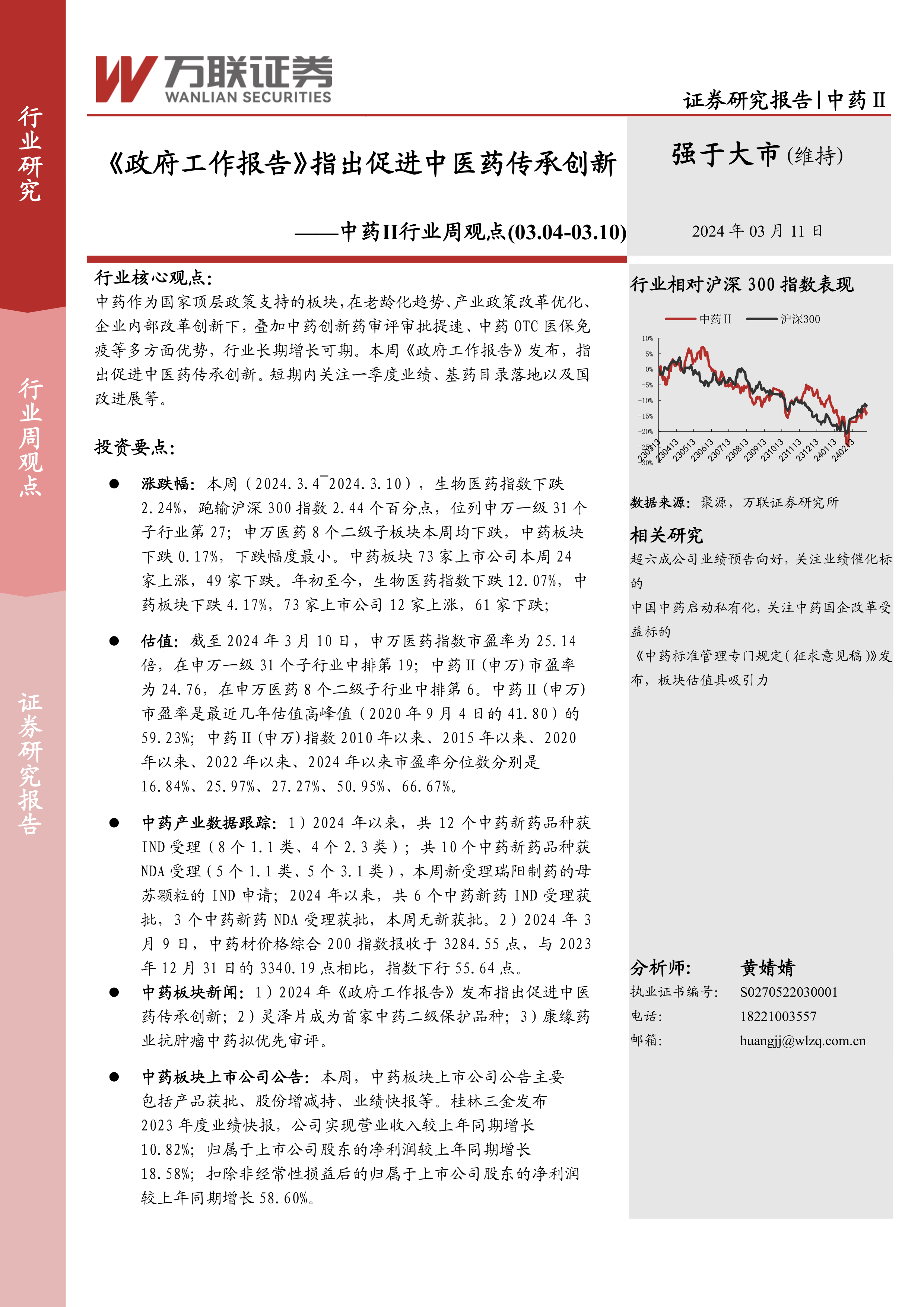 中药Ⅱ行业周观点:《政府工作报告》指出促进中医药传承创新