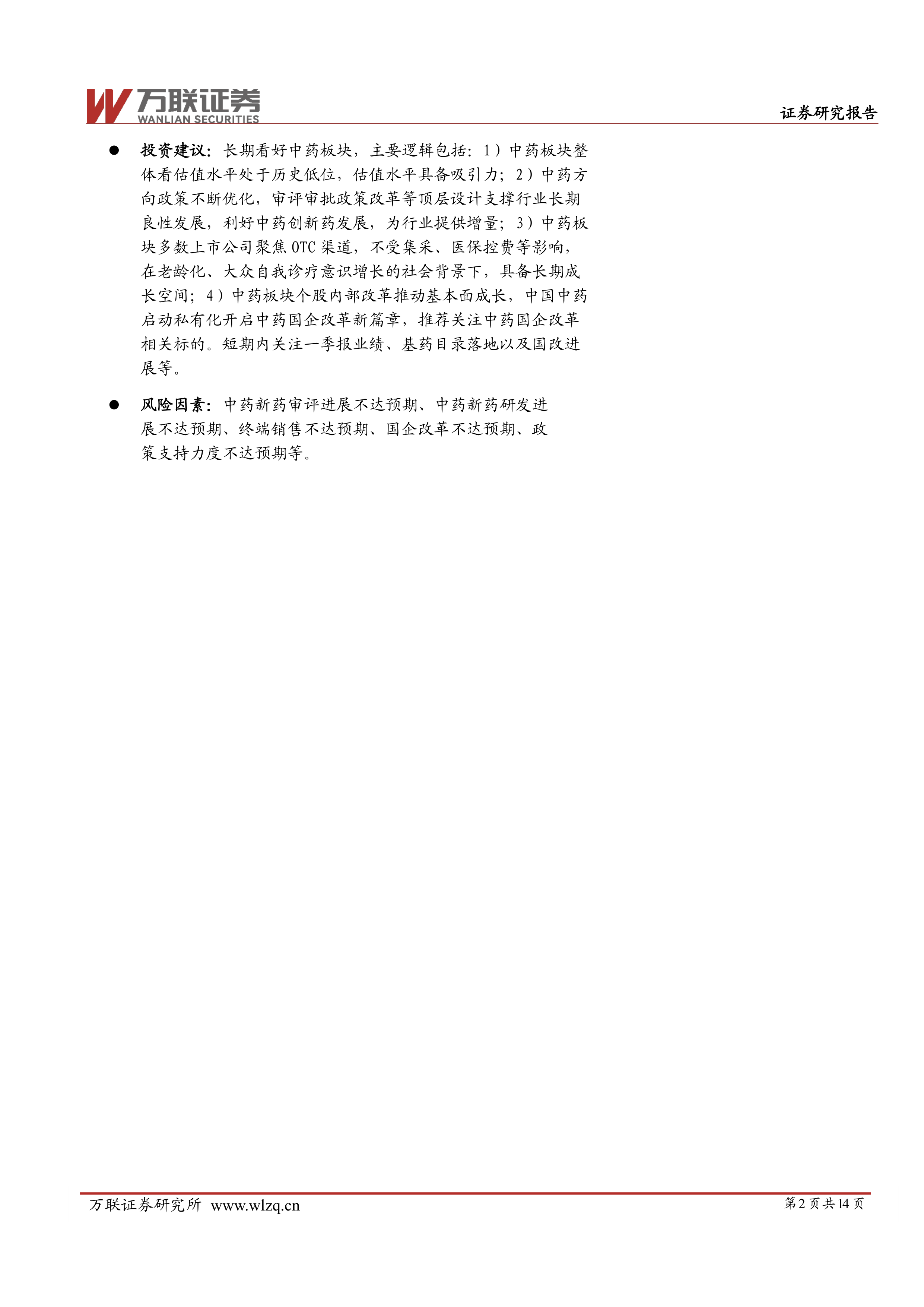 报告最后给出了投资建议:长期看好中药板块,短期关注一季度业绩、基药目录落地以及国企改革进展。 报告也列出了潜在的风险因素,例如中药新药审评进展不达预期、研发进展不达预期、终端销售不达预期、国企改革不达预期以及政策支持力度不达预期等。