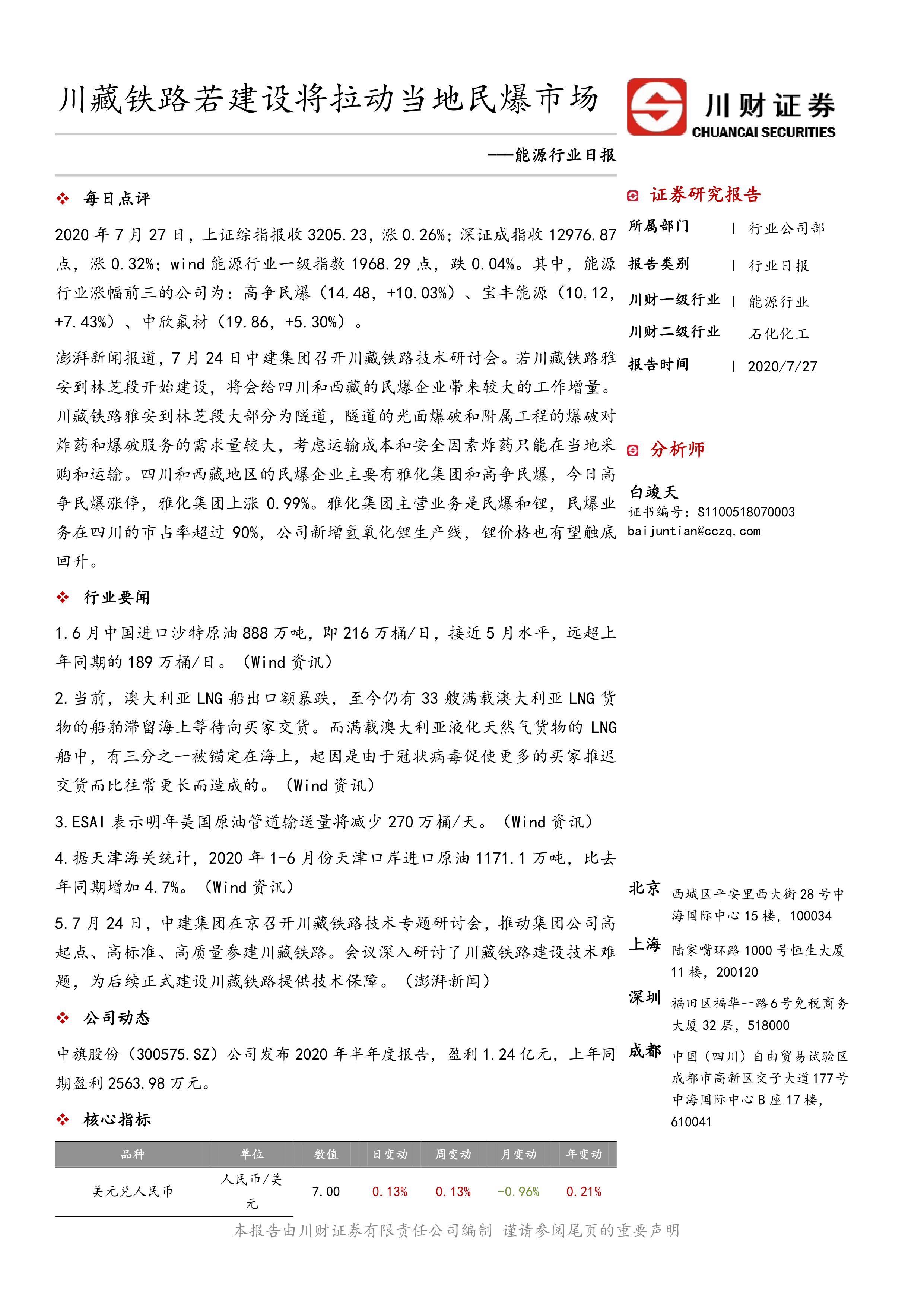 本报告为川财证券能源行业日报,发布日期为2020年7月27日。报告主要内容包括市场概述、行业要闻、公司动态、核心指标以及风险提示等方面。