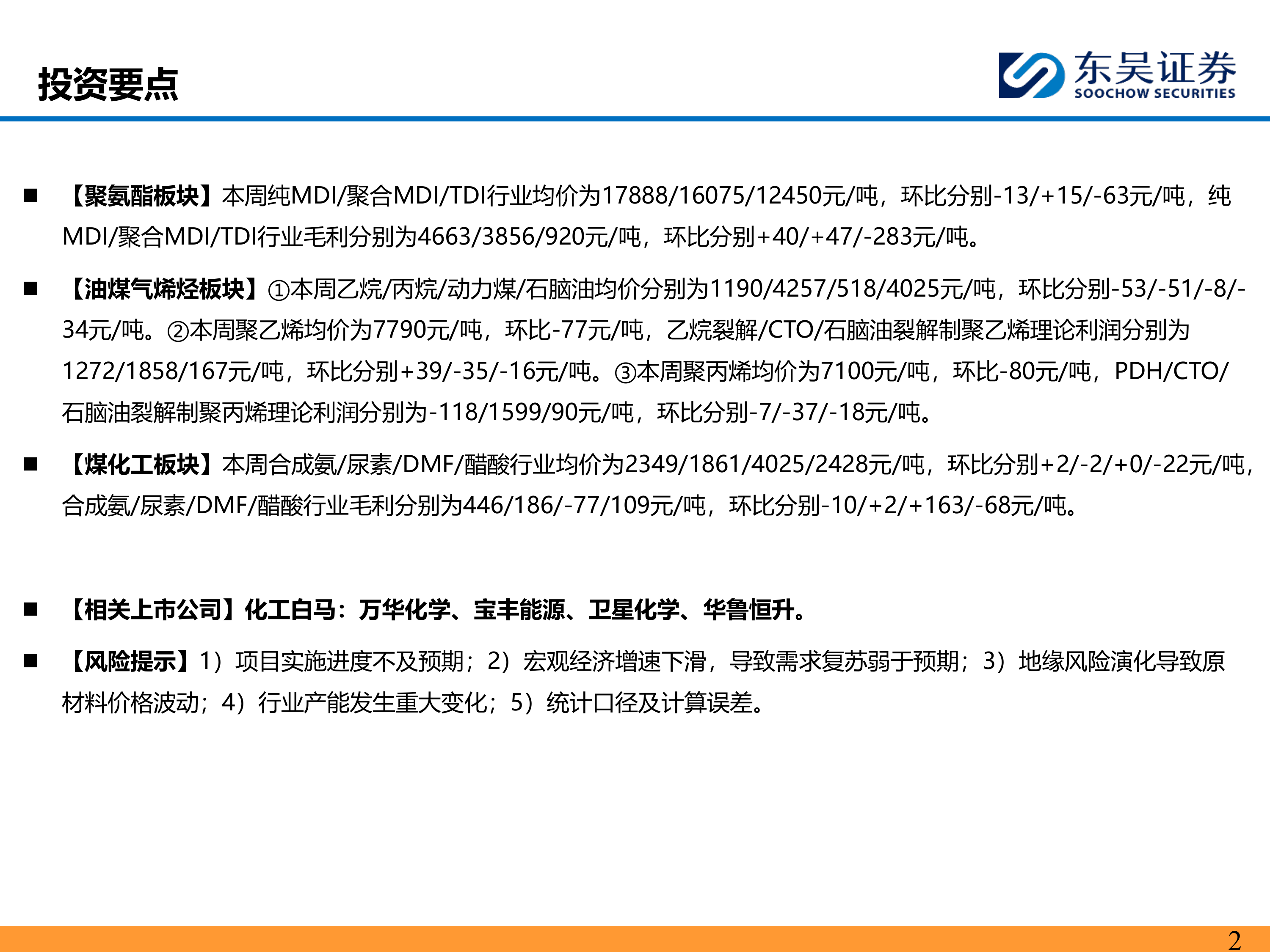 报告中提到的相关上市公司(万华化学、宝丰能源、卫星化学、华鲁恒升)股价涨跌幅度不一,部分公司盈利能力也存在差异。报告同时列出了五个主要的风险提示,包括项目实施进度不及预期、宏观经济增速下滑、地缘风险演化、行业产能变化以及统计口径和计算误差,投资者需谨慎评估。