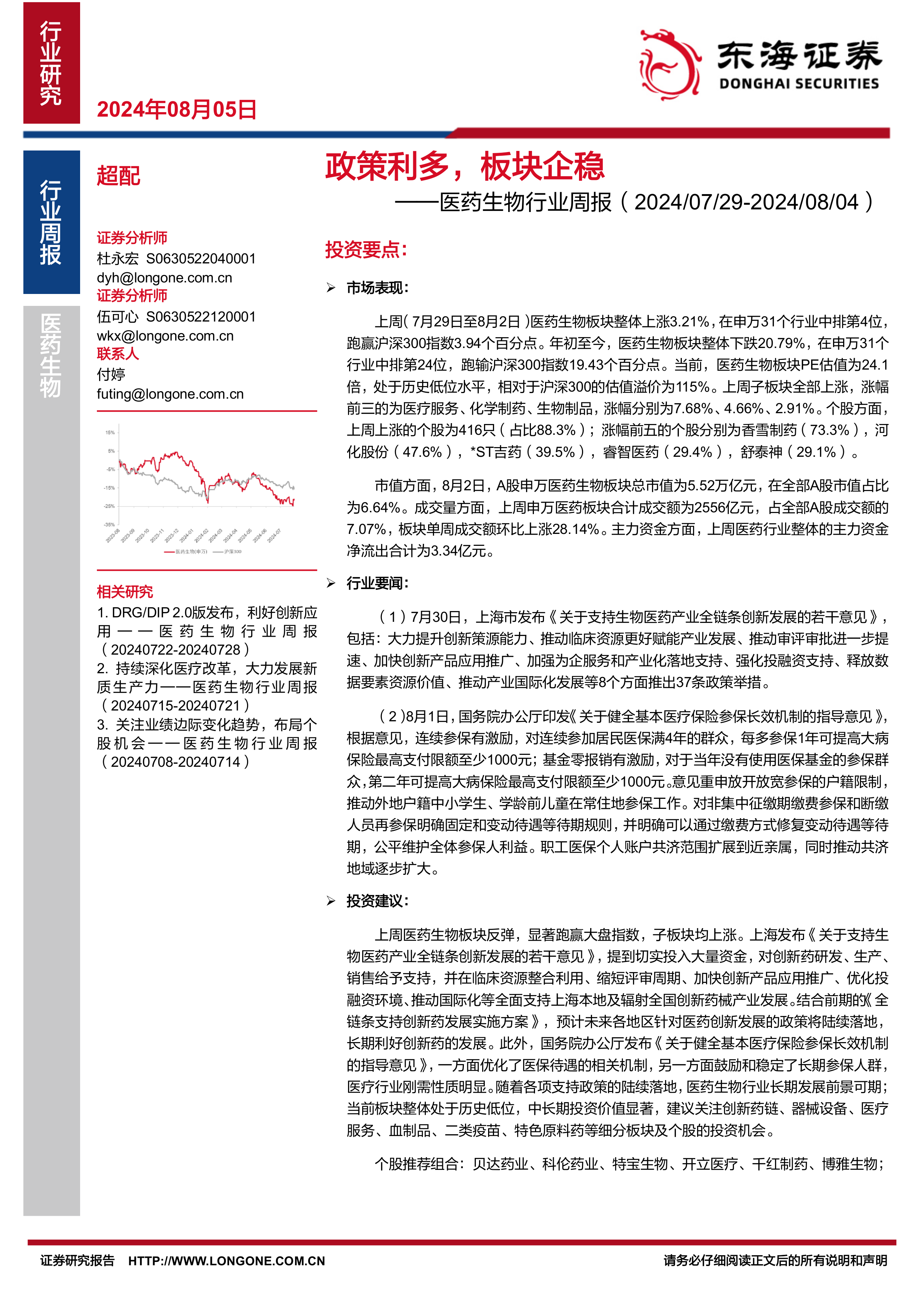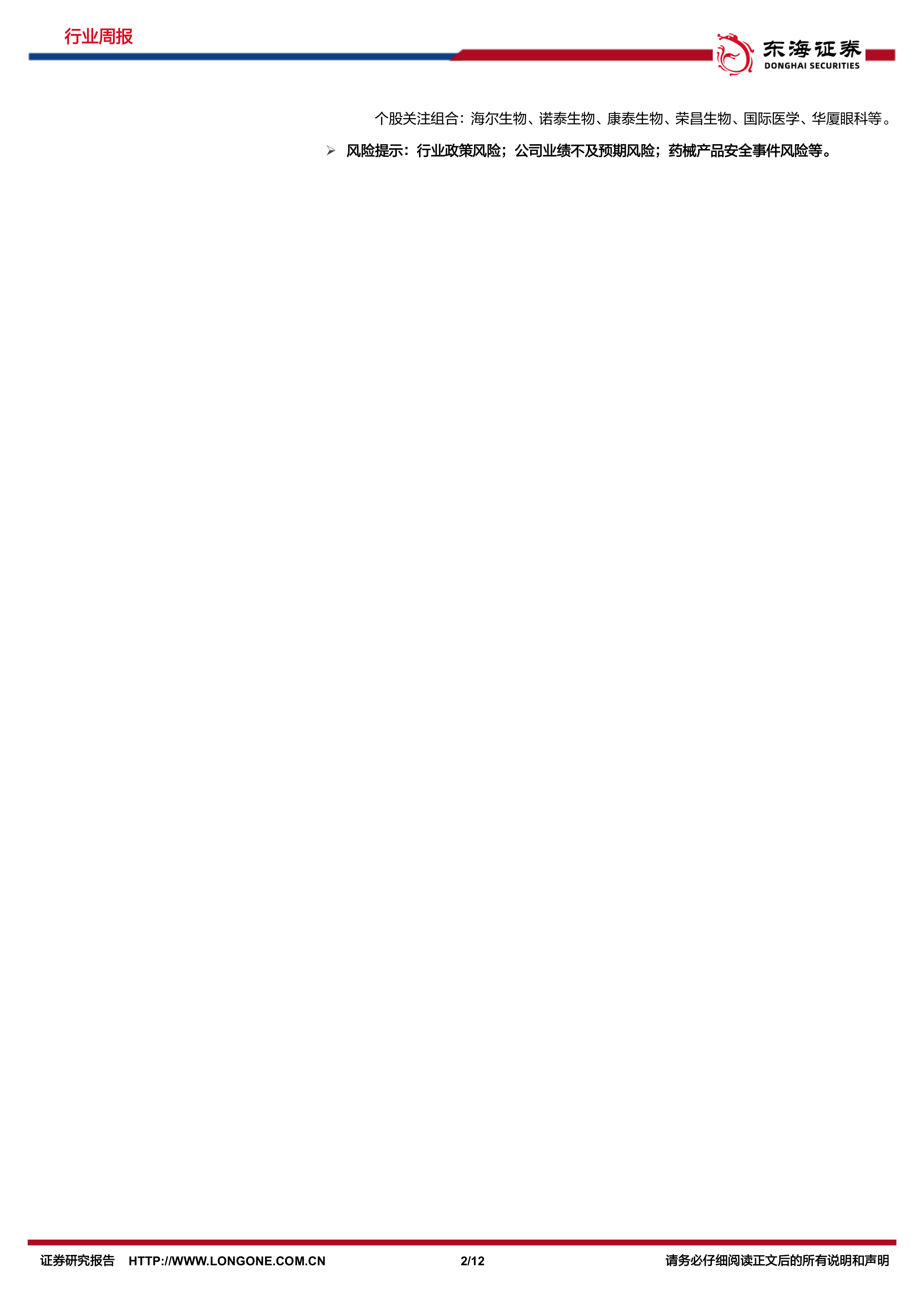 个股推荐组合:贝达药业、科伦药业、特宝生物、开立医疗、千红制药、博雅生物;个股关注组合:海尔生物、诺泰生物、康泰生物、荣昌生物、国际医学、华厦眼科等