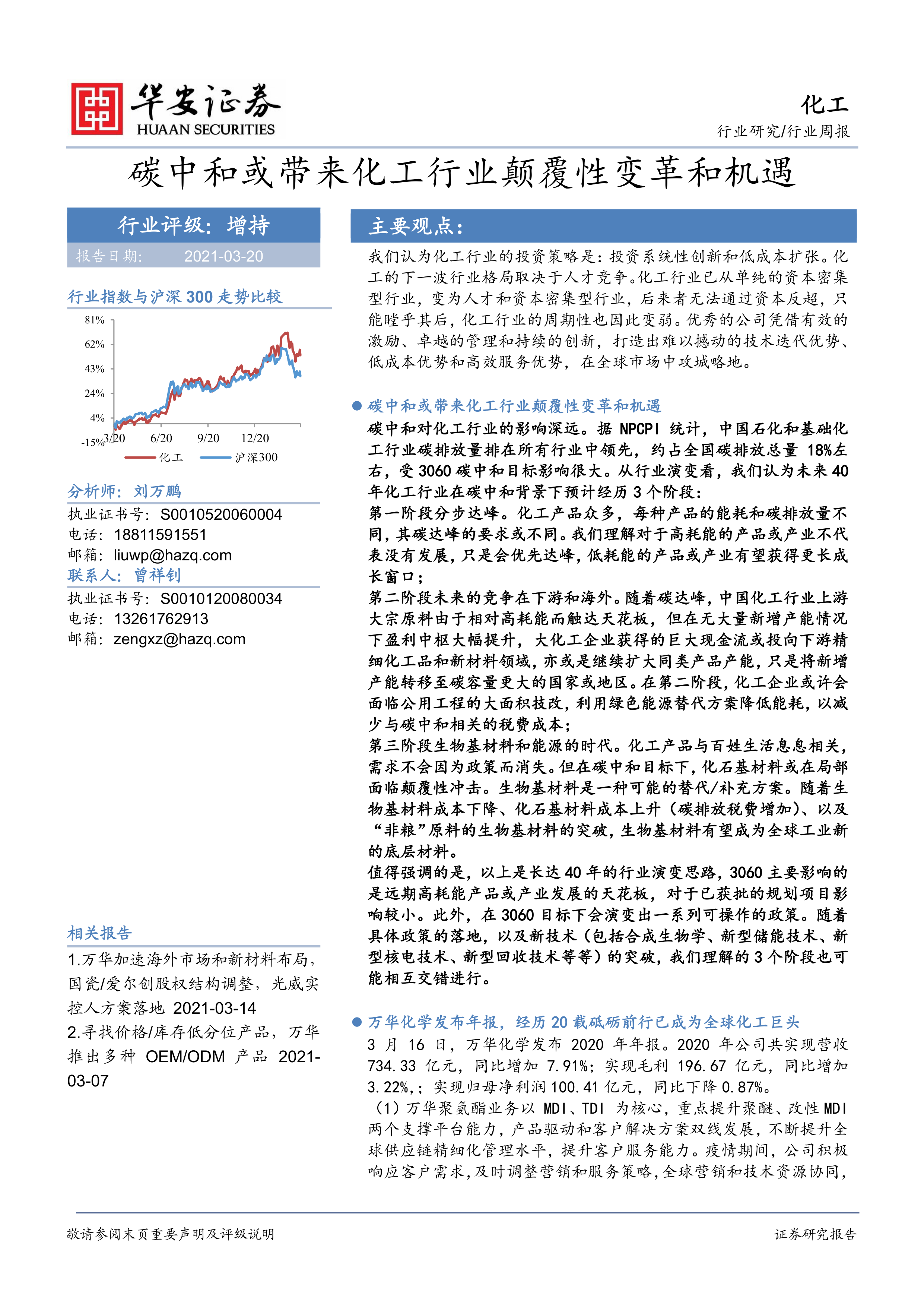 化工行业周报:碳中和或带来化工行业颠覆性变革和机遇
