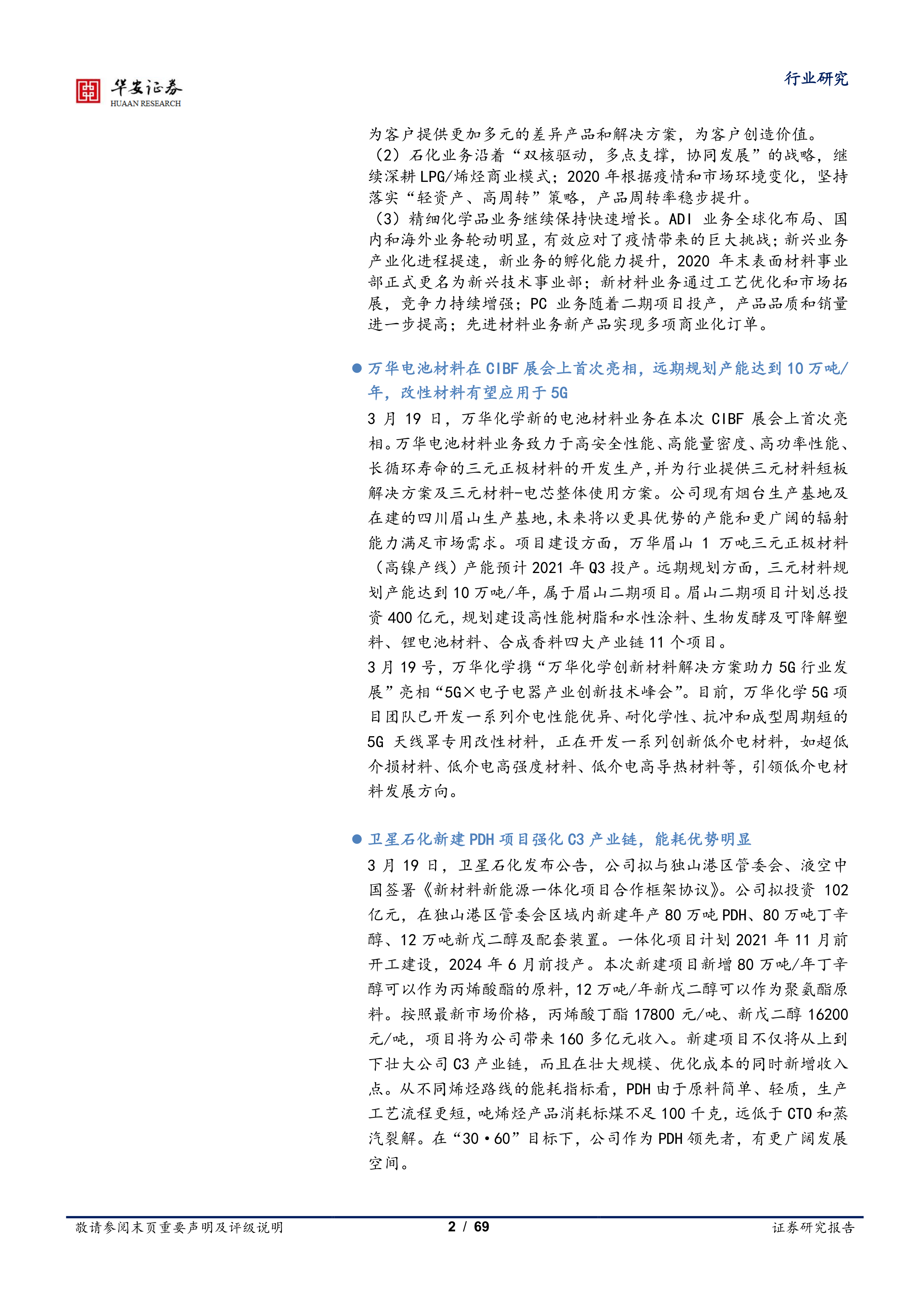 (3)精细化学品业务继续保持快速增长。ADI业务全球化布局、国内和海外业务轮动明显,有效应对了疫情带来的巨大挑战;新兴业务产业化进程提速,新业务的孵化能力提升,2020年末表面材料事业部正式更名为新兴技术事业部;新材料业务通过工艺优化和市场拓展,竞争力持续增强;PC业务随着二期项目投产,产品品质和销量进一步提高;先进材料业务新产品实现多项商业化订单。