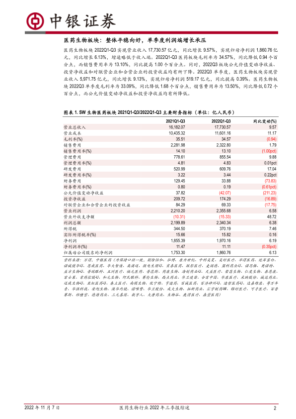 医药生物行业2022年三季报综述:整体发展相对平稳,估值上升趋势初现