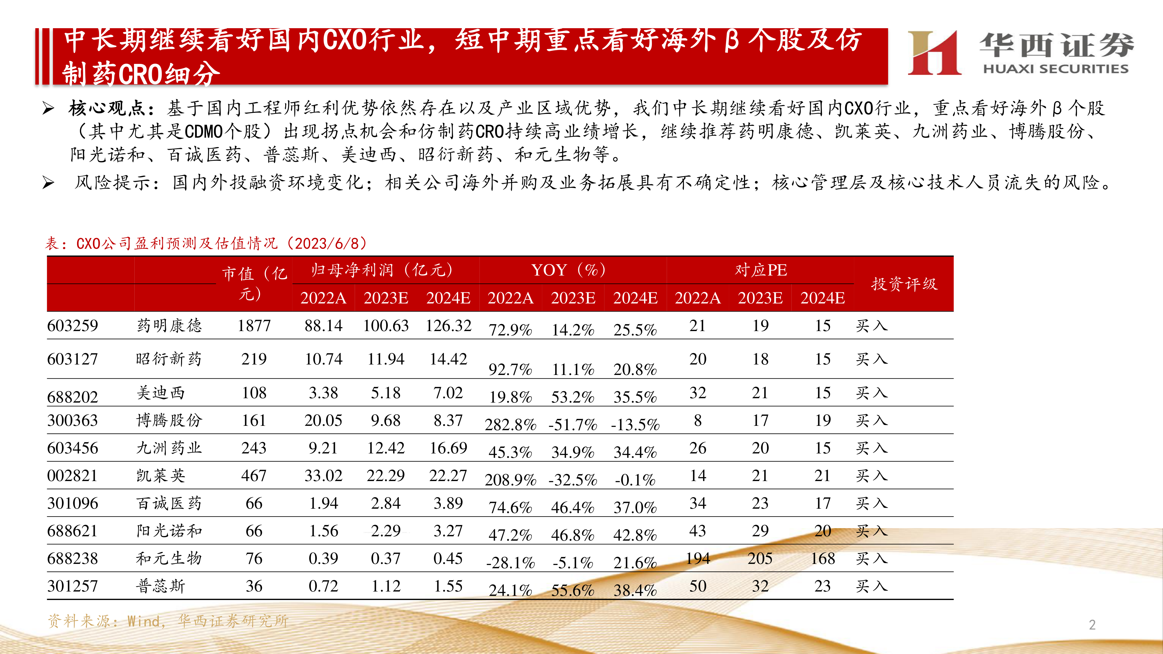 核心观点:基于国内工程师红利优势依然存在以及产业区域优势,我们中长期继续看好国内CXO行业,重点看好海外β个股(其中尤其是CDMO个股)出现拐点机会和仿制药CRO持续高业绩增长,继续推荐药明康德、凯莱英、九洲药业、博腾股份、阳光诺和、百诚医药、普蕊斯、美迪西、昭衍新药、和元生物等。