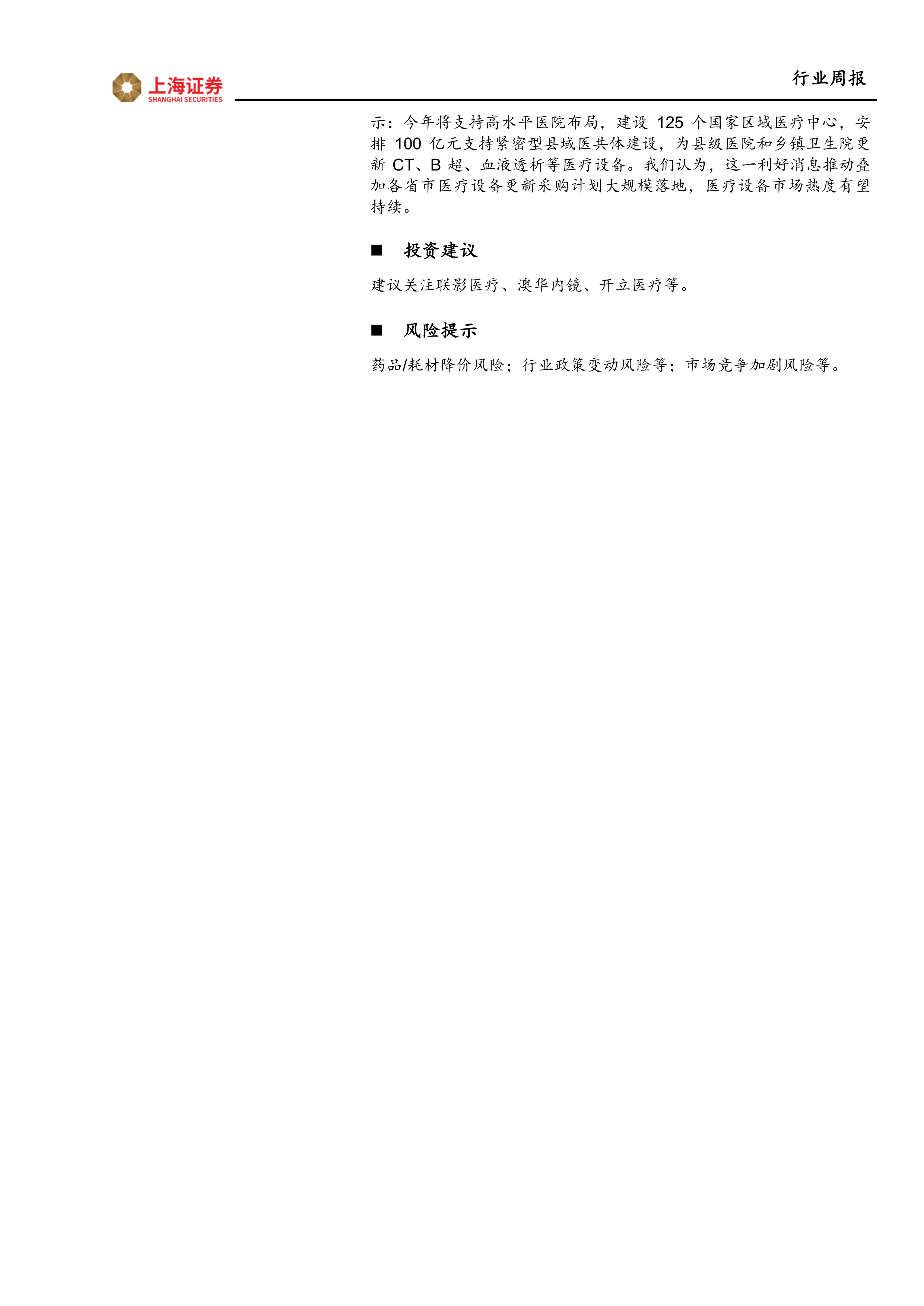 建议关注联影医疗、澳华内镜、开立医疗等。