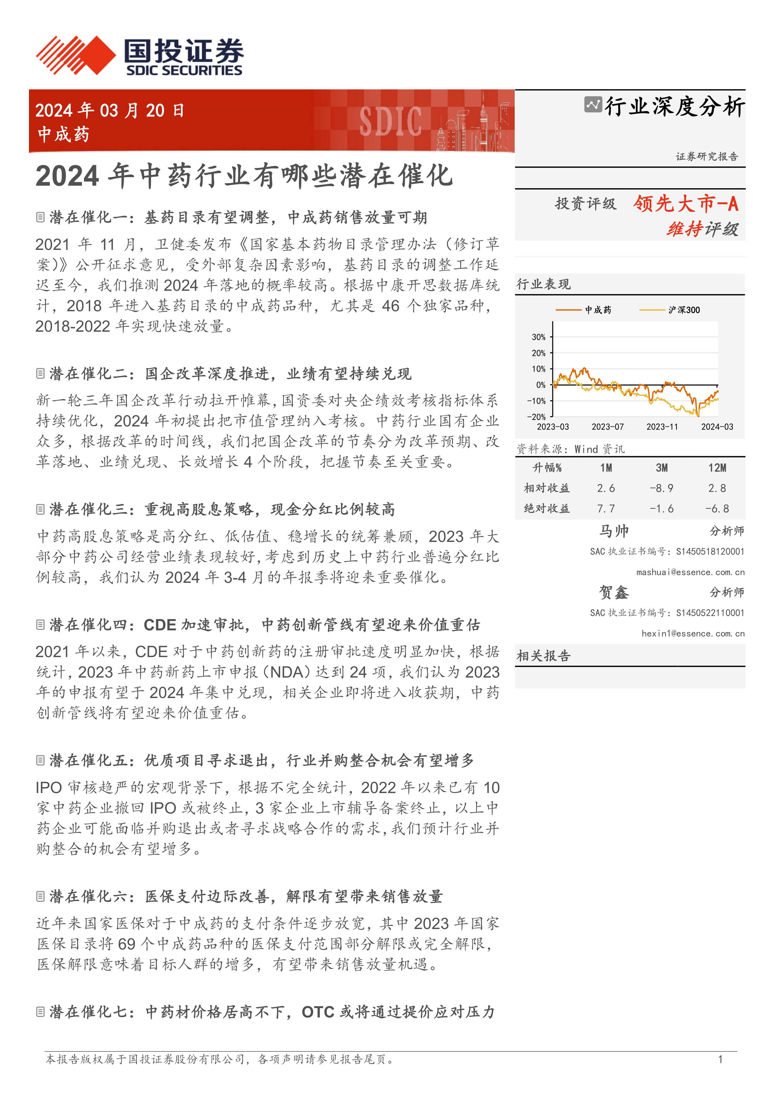 本报告的核心观点是:2024年中药行业存在诸多潜在催化剂,可能推动行业发展和相关上市公司业绩增长。这些催化剂主要包括:基药目录调整、国企改革深化、高股息策略、CDE加速审批、行业并购整合、医保支付改善、中药材提价、股权激励、呼吸道疾病高发和降本增效等十个方面。报告对这些催化剂进行了详细分析,并选取了部分具有代表性的中药上市公司进行案例解读,最终给出领先大市的投资评级。