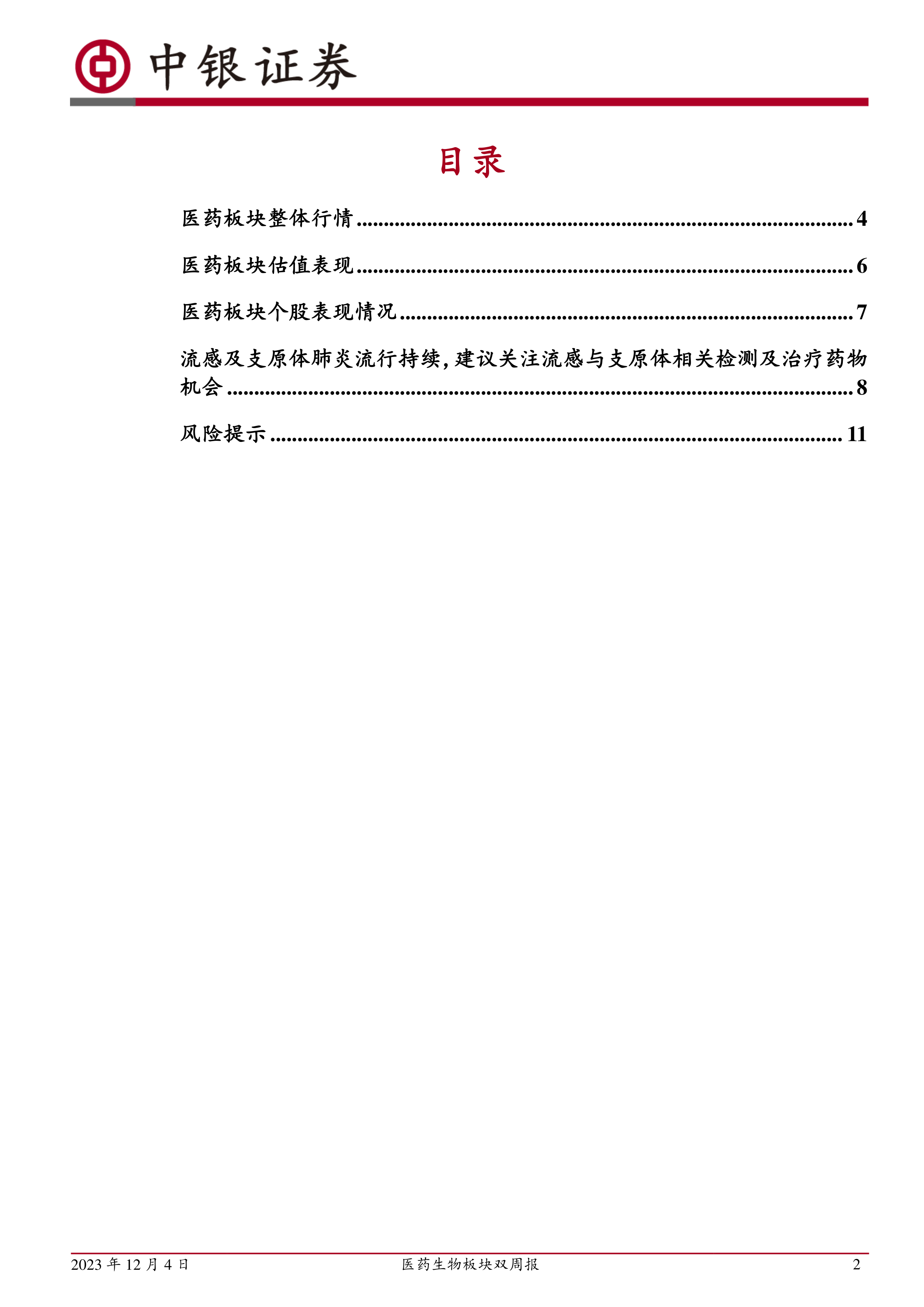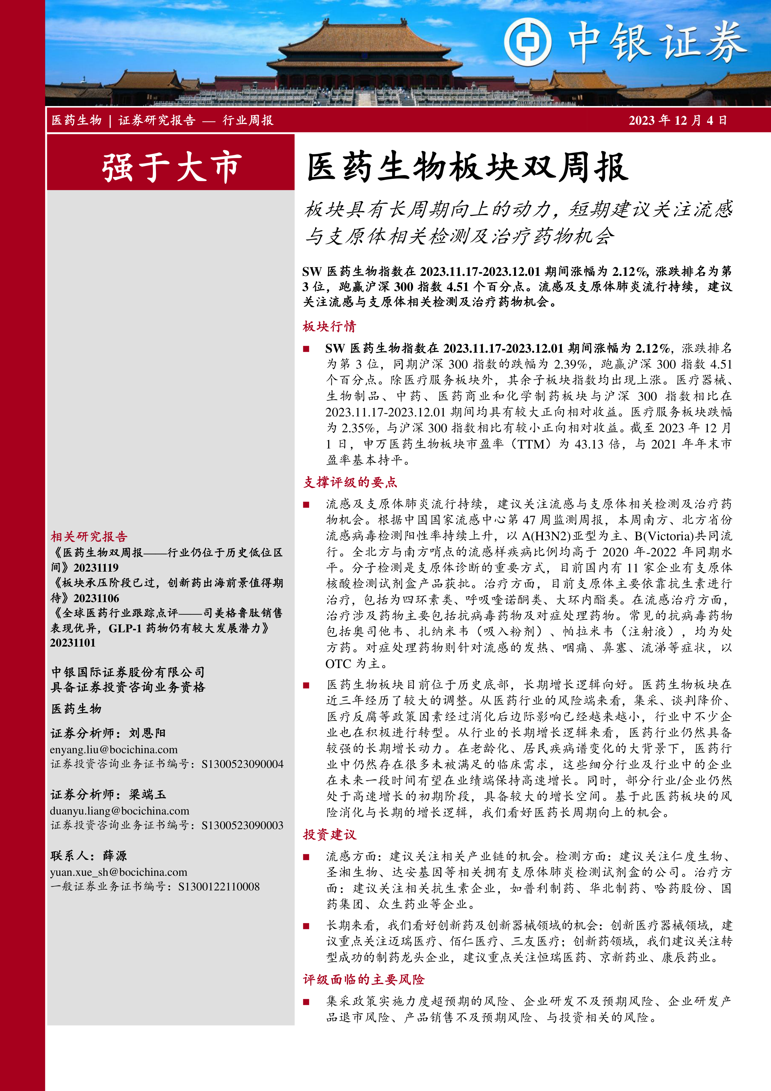 本报告对医药生物板块的近期和长期走势进行了分析,指出短期内流感和支原体肺炎疫情为相关检测和治疗药物带来投资机会,长期来看,板块具备向上动力,创新药和创新医疗器械领域潜力巨大。 报告同时提示了潜在的投资风险,建议投资者谨慎决策,结合自身风险承受能力进行投资。 报告数据主要基于2023年11月17日至12月1日期间的市场表现和公开信息,未来市场走势可能存在变化。