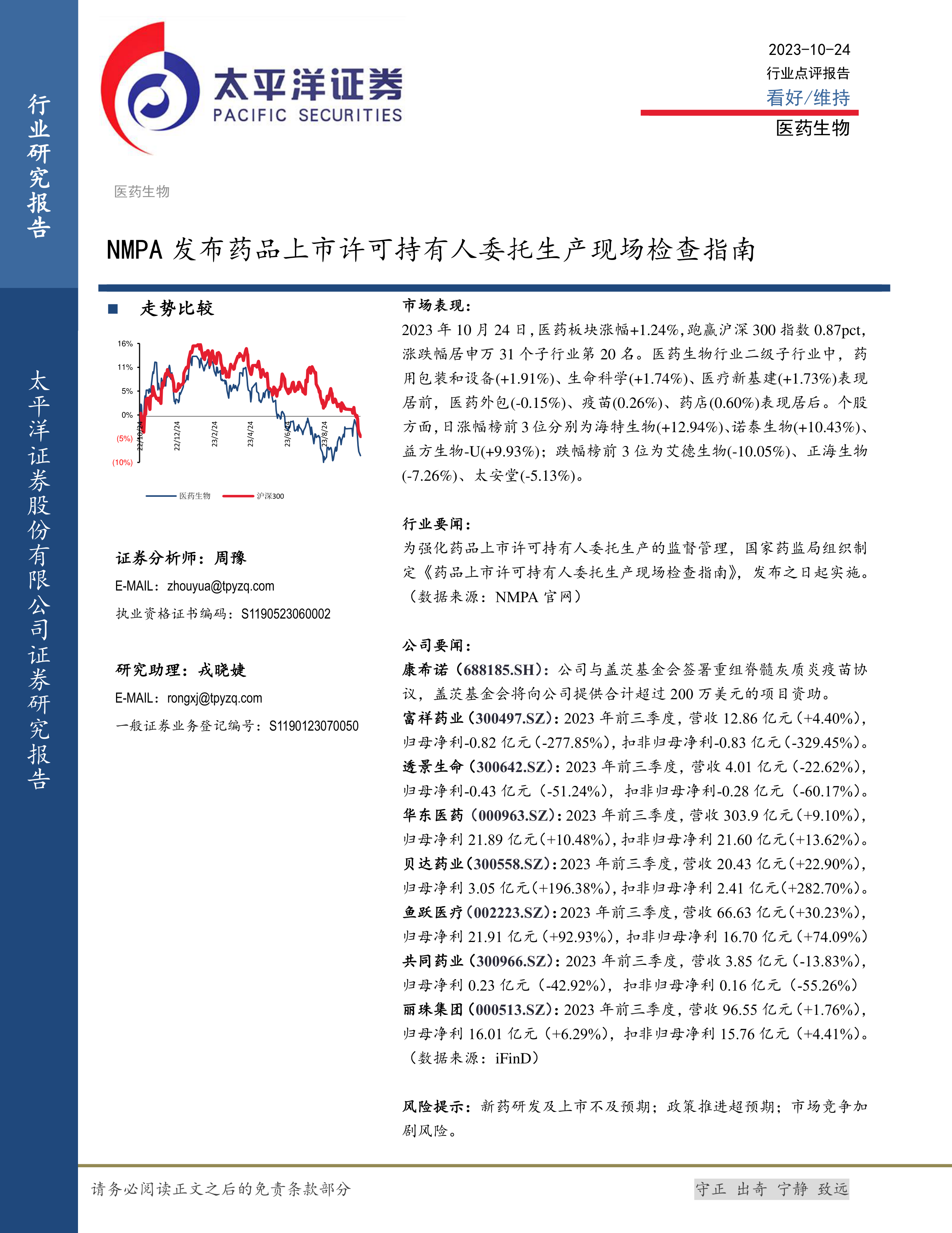 本报告的核心观点是:2023年10月24日,医药板块整体表现强于大盘,部分细分领域表现突出,但个股涨跌分化明显。国家药监局发布的《药品上市许可持有人委托生产现场检查指南》对行业监管带来影响,部分公司三季度业绩表现亮眼,但也存在业绩下滑的情况。