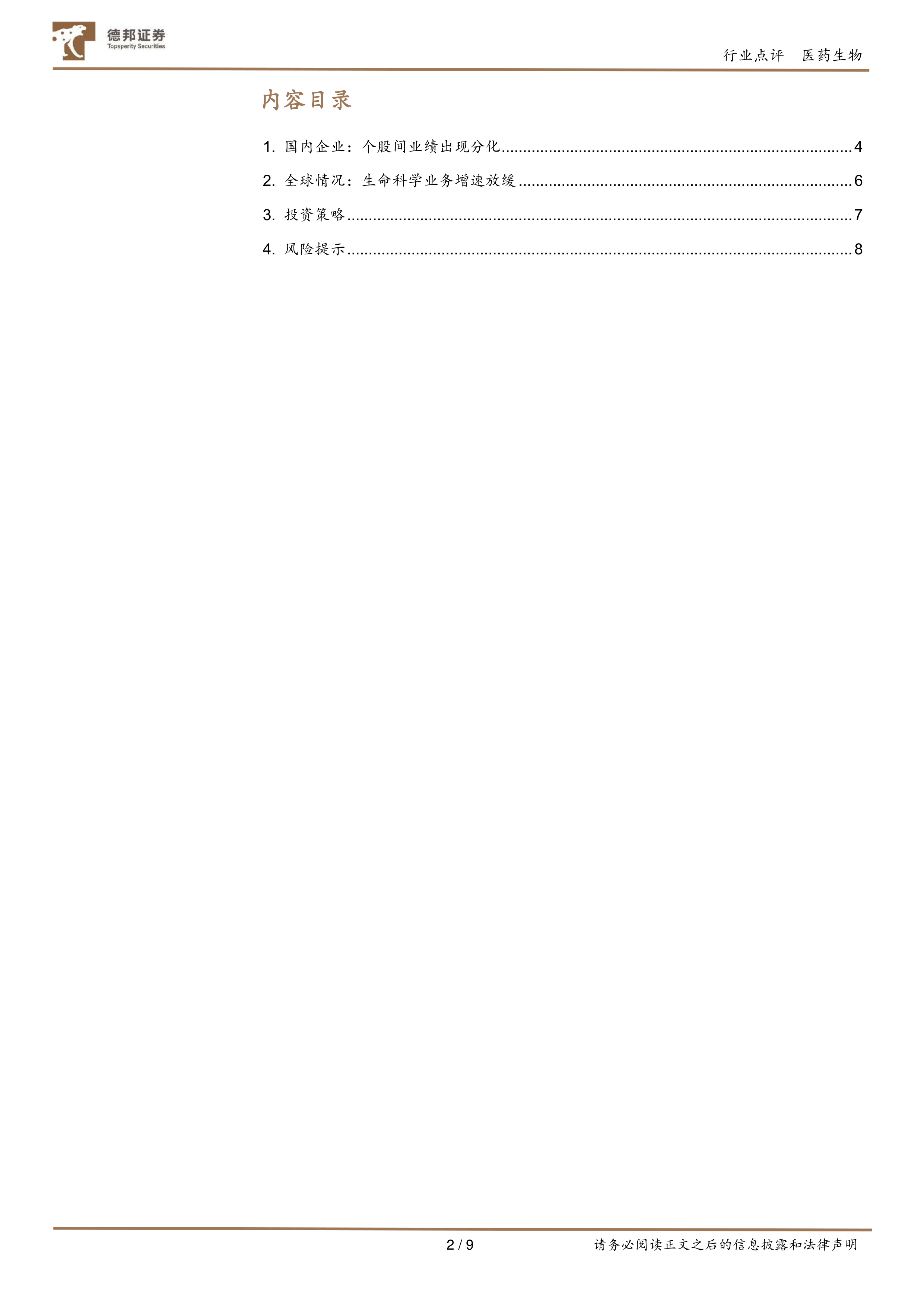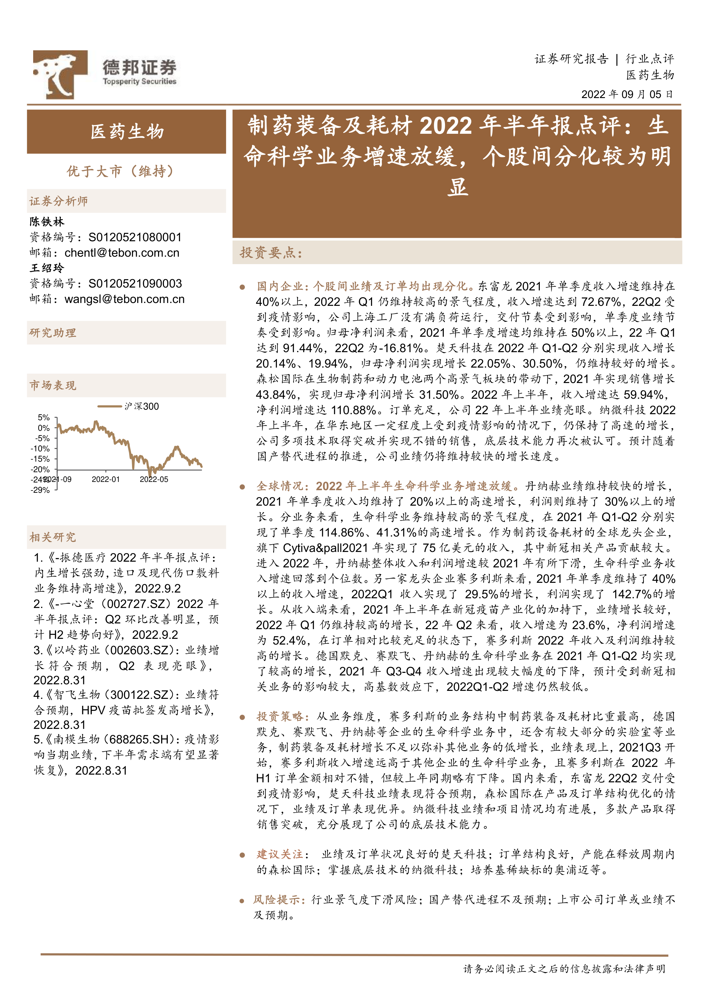 本报告对2022年上半年制药装备及耗材市场进行了深入分析,指出全球生命科学业务增速放缓,而国内市场呈现出个股间显著分化的态势。 国际龙头企业受高基数效应和新冠相关业务影响,增速回落;国内企业则表现差异化,部分企业业绩亮眼,部分企业受疫情影响业绩下滑。 报告建议投资者关注业绩和订单状况良好的企业,并需谨慎评估行业景气度下滑、国产替代进程不及预期以及公司业绩不及预期等风险。 报告提供的图表数据和分析结论,为投资者进行投资决策提供了重要的参考依据。