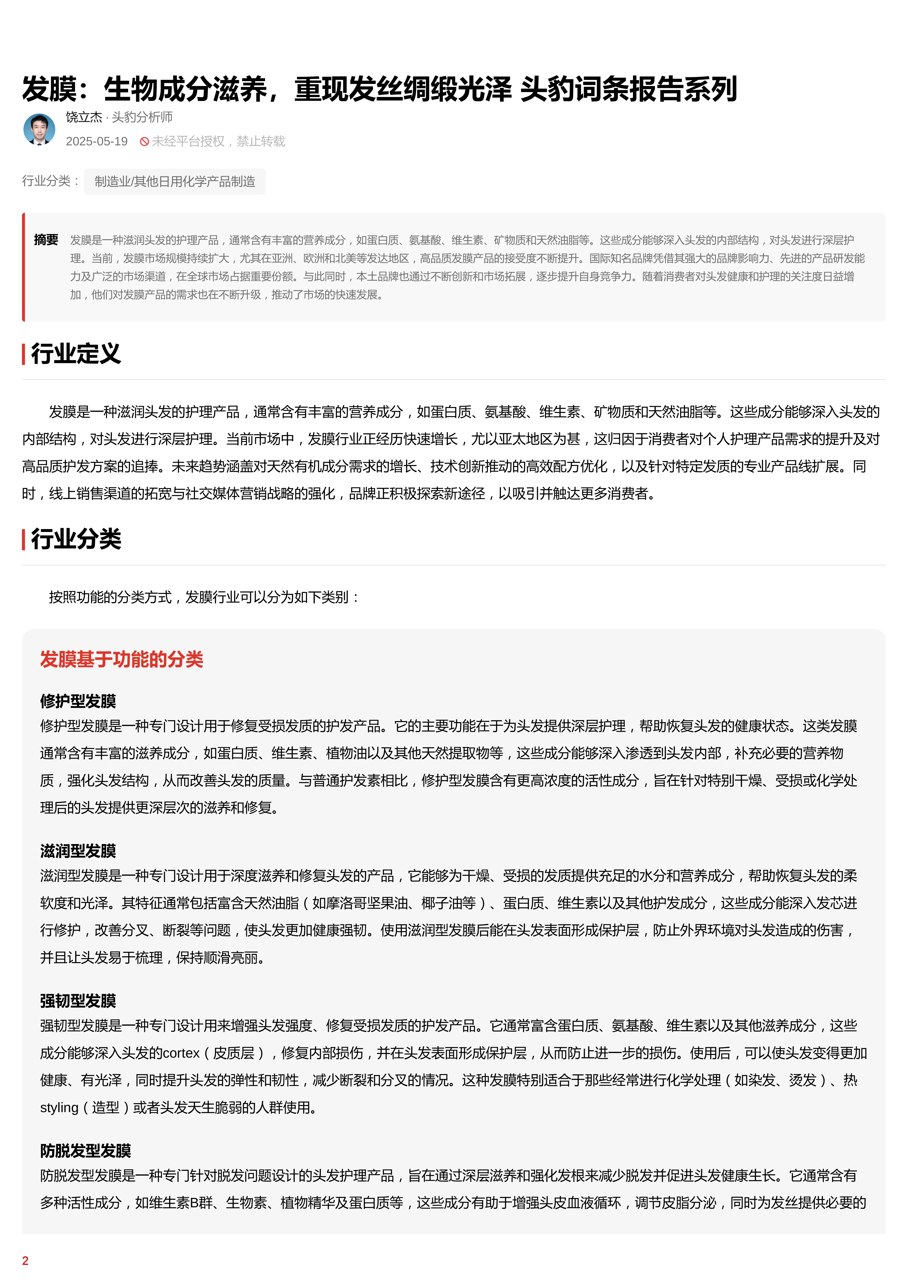 本报告基于头豹研究院发布的《2025年发膜行业词条报告》,对中国发膜市场进行数据分析和市场解读。报告核心观点如下:
