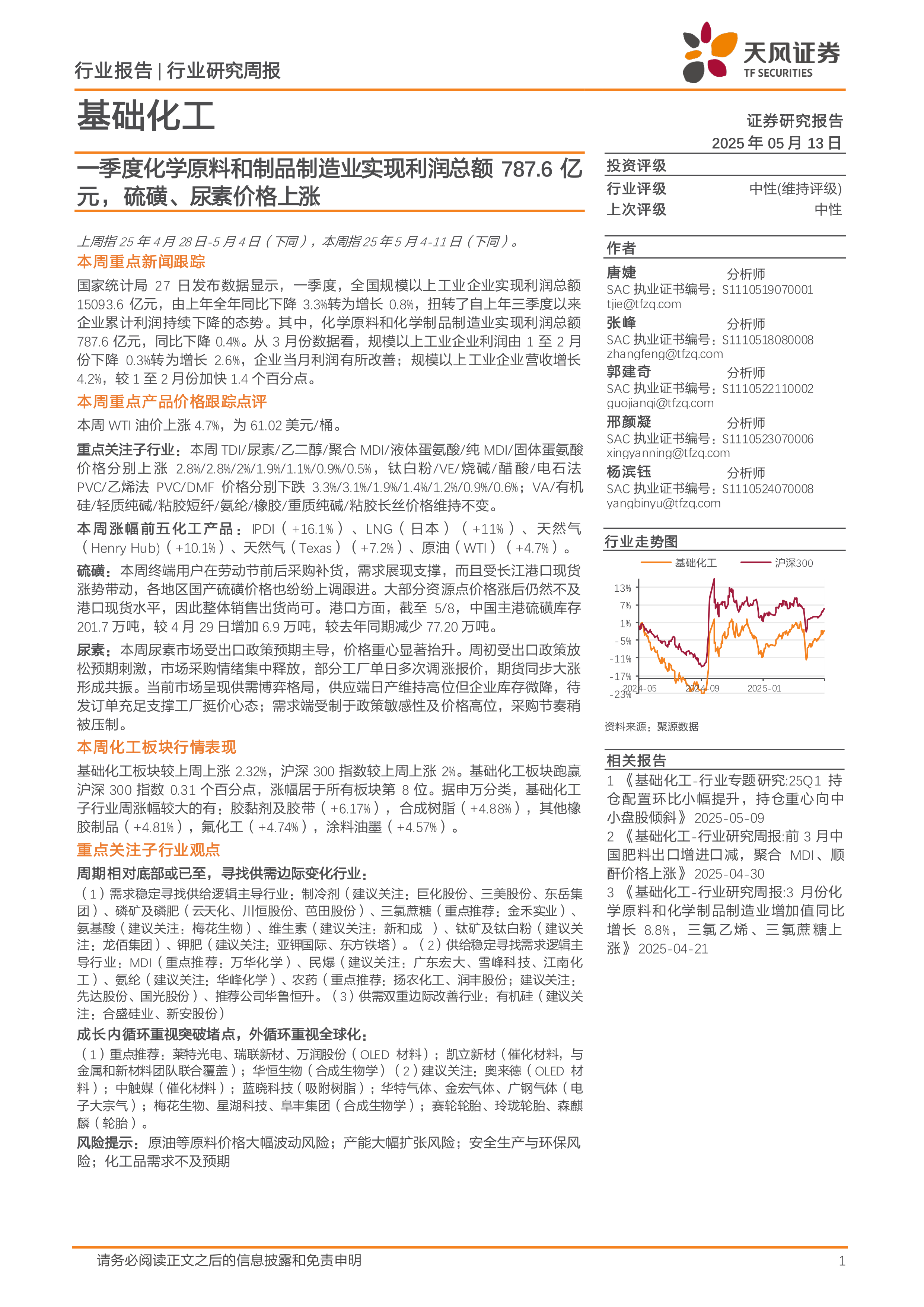 基础化工行业研究周报:一季度化学原料和制品制造业实现利润总额787.6亿元,硫磺、尿素价格上涨