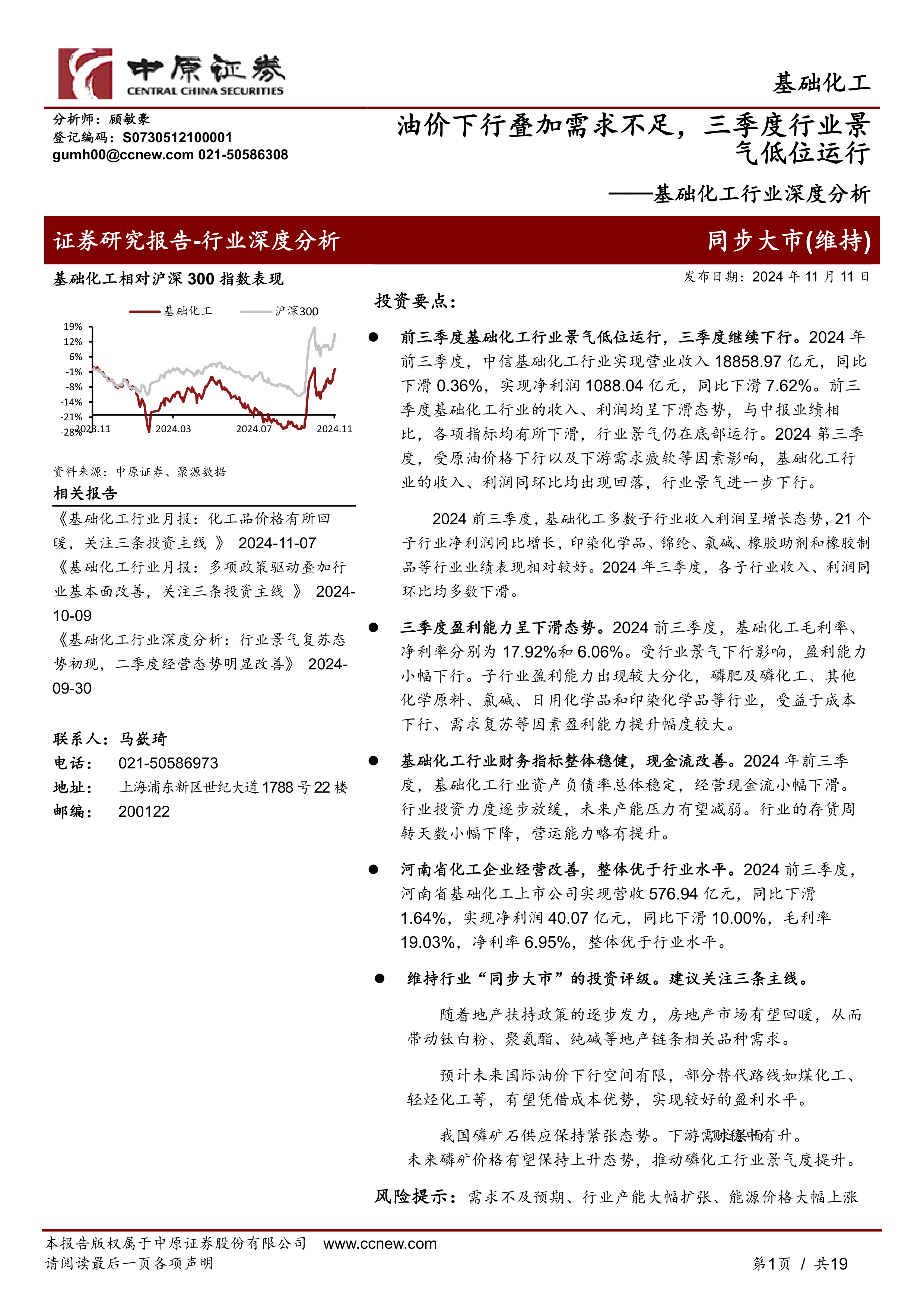 本报告对2024年前三季度中国基础化工行业进行了深入分析,数据显示行业整体景气度低位运行,三季度进一步下行,盈利能力有所回落。虽然子行业间表现分化,但整体财务指标相对稳健。河南省基础化工上市公司表现优于行业平均水平。展望未来,报告建议投资者关注房地产产业链相关化学品、原油替代路线以及磷化工行业三个投资主线,同时需关注下游需求、行业竞争和能源价格等风险因素。 报告数据主要来源于中原证券研究所和wind数据库。