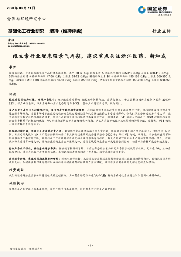 基础化工行业研究:维生素行业迎来强景气周期,建议重点关注浙江医药、新和成