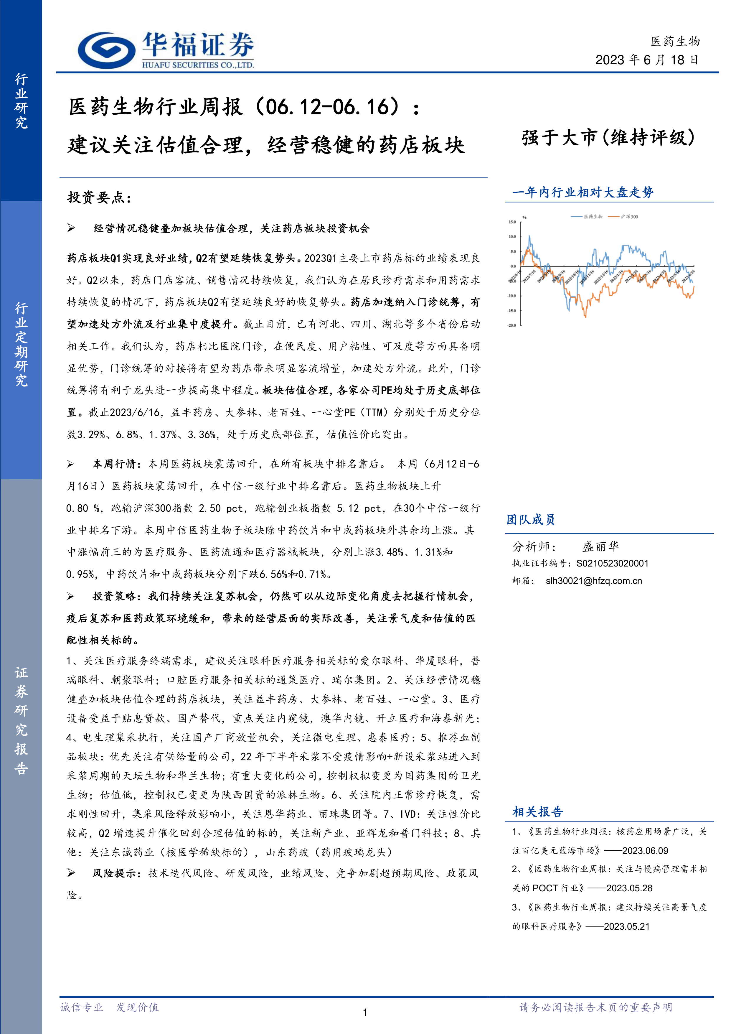 药店板块Q1实现良好业绩, Q2有望延续恢复势头。 2023Q1主要上市药店标的业绩表现良好。 Q2以来,药店门店客流、销售情况持续恢复,我们认为在居民诊疗需求和用药需求持续恢复的情况下,药店板块Q2有望延续良好的恢复势头。 药店加速纳入门诊统筹,有望加速处方外流及行业集中度提升。 截止目前,已有河北、四川、湖北等多个省份启动相关工作。我们认为,药店相比医院门诊,在便民度、用户粘性、可及度等方面具备明显优势,门诊统筹的对接将有望为药店带来明显客流增量,加速处方外流。此外,门诊统筹将有利于龙头进一步提高集中程度。 板块估值合理,各家公司PE均处于历史底部位置。 截止2023/6/16,益丰药房、大参林、老百姓、一心堂PE( TTM)分别处于历史分位数3.29%、 6.8%、 1.37%、 3.36%,处于历史底部位置,估值性价比突出。
