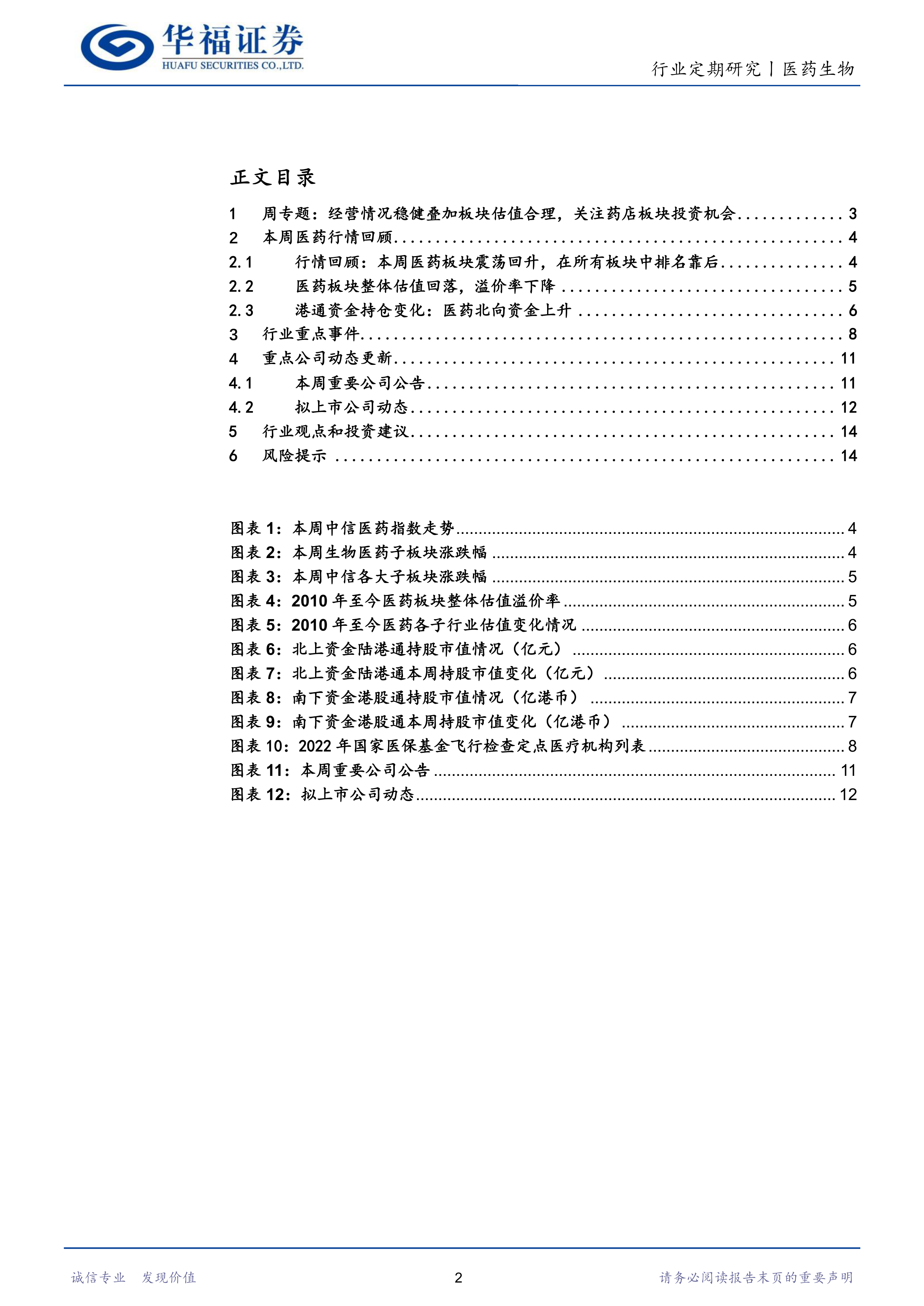 本部分回顾了本周医药板块的行情表现,指出其震荡回升但排名靠后的现状。 具体数据包括医药生物板块的涨跌幅,以及与沪深300指数和创业板指数的比较。 此外,还对各个子板块(医疗服务、医药流通、医疗器械、中药饮片、中成药等)的涨跌幅进行了详细的分析,并列举了涨跌幅较大的个股。 最后,本部分还分析了医药板块整体估值回落和溢价率下降的情况,以及北上资金和南下资金在医药板块的持仓变化。