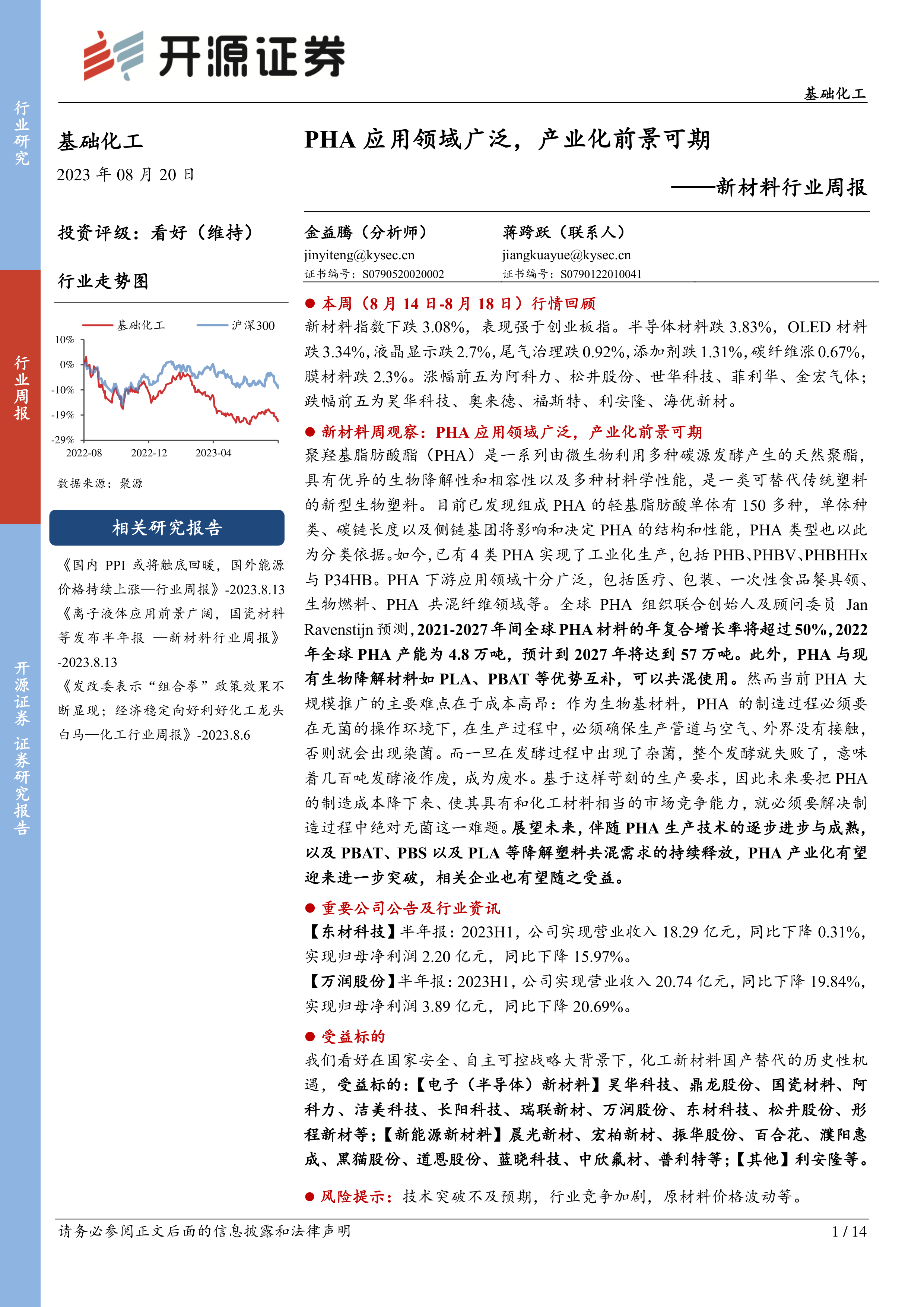 本报告首先回顾了本周(8月14日-8月18日)新材料行业的行情,新材料指数表现强于创业板指,部分个股涨跌幅度较大。随后,重点关注了PHA的应用领域和产业化前景,分析了其市场潜力和面临的挑战。