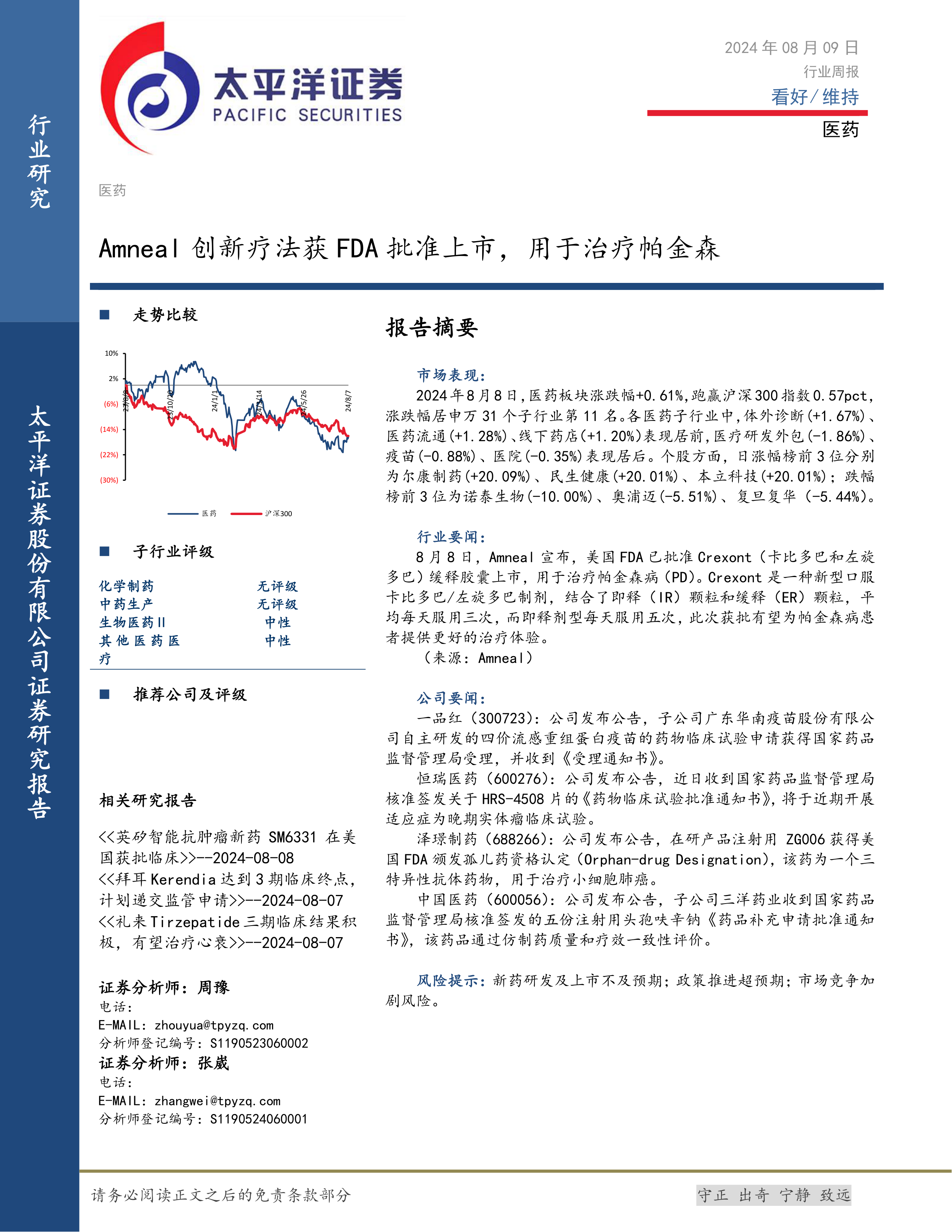 本报告的核心观点是:2024年8月9日,医药行业整体表现略微上涨,但子行业表现分化明显。Amneal公司创新疗法获批上市为帕金森病治疗带来新希望,同时多家公司在研发方面取得进展,展现了医药行业持续发展的潜力。然而,个股表现波动较大,风险依然存在。