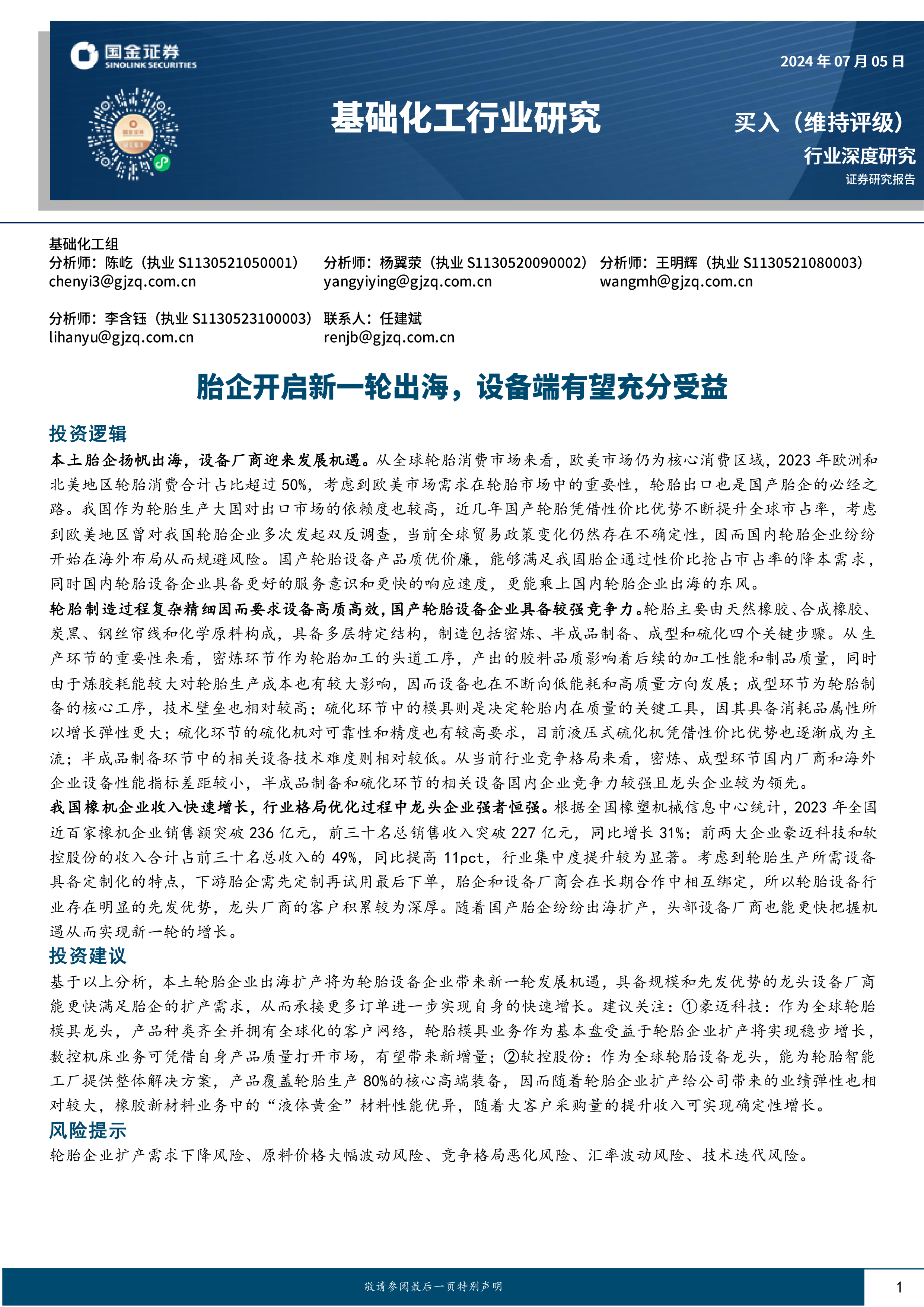 本报告分析了中国轮胎企业出海对国内轮胎设备行业带来的机遇与挑战。 中国轮胎设备企业凭借性价比优势和技术实力,有望在全球市场中占据更大的份额。 龙头企业豪迈科技和软控股份凭借其规模优势、技术优势和先发优势,有望在行业发展中获得更大的收益。 然而,投资者也需要关注行业潜在的风险,谨慎投资。 本报告仅供参考,不构成投资建议。