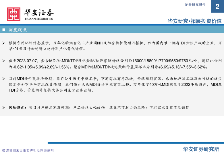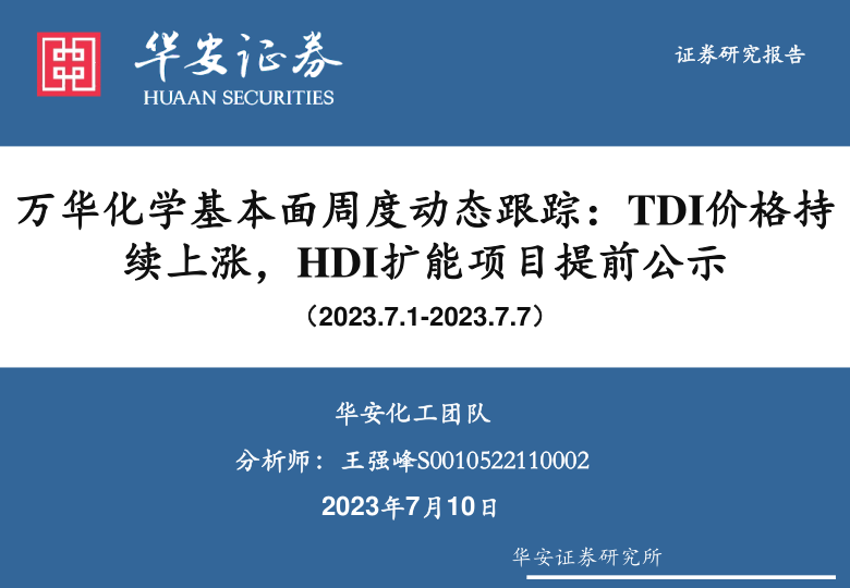 万华化学基本面周度动态跟踪:TDI价格持续上涨,HDI扩能项目提前公示