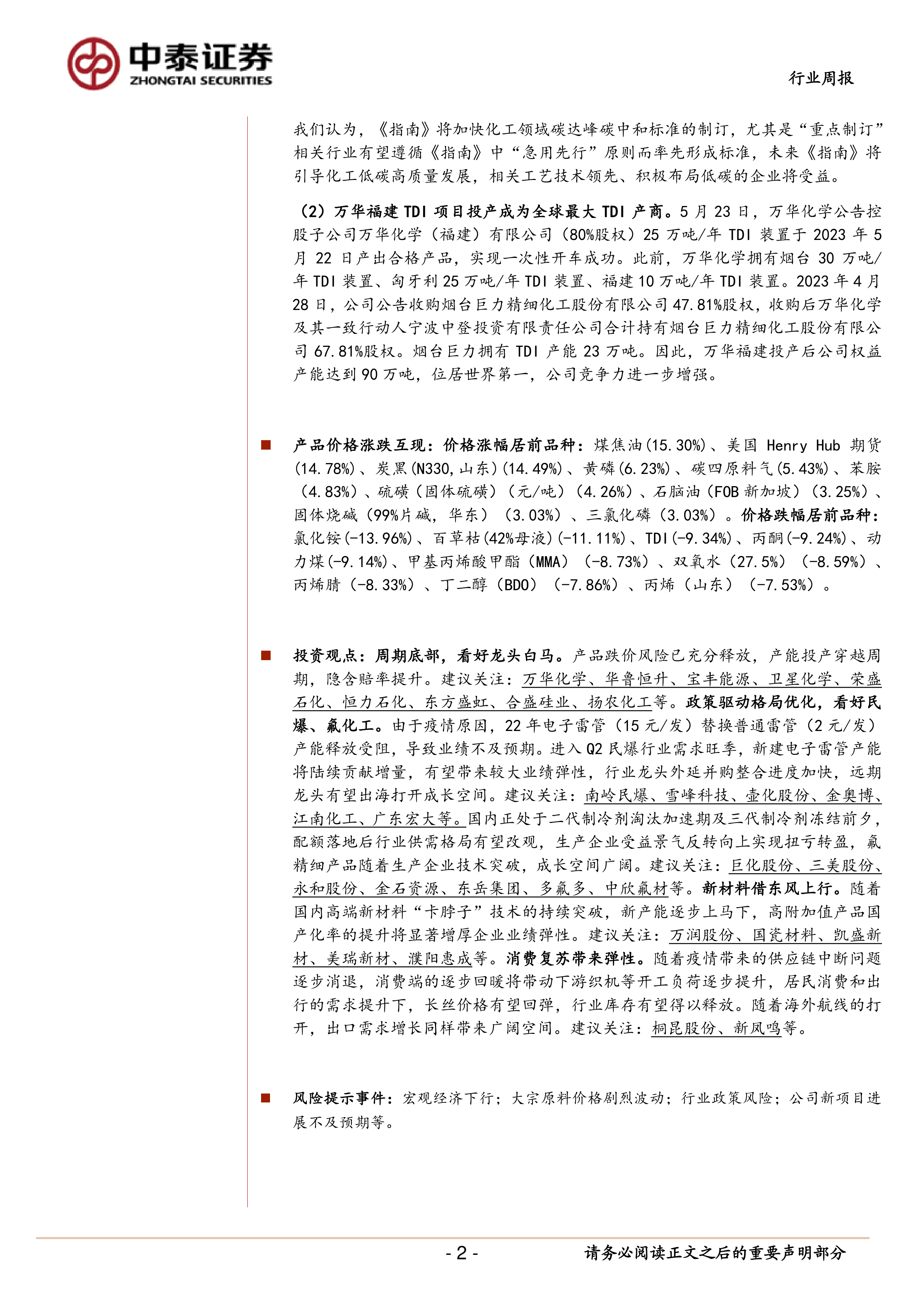 投资观点:周期底部,看好龙头白马。产品跌价风险已充分释放,产能投产穿越周期,隐含赔率提升。建议关注:万华化学、华鲁恒升、宝丰能源、卫星化学、荣盛石化、恒力石化、东方盛虹、合盛硅业、扬农化工等。政策驱动格局优化,看好民爆、氟化工。由于疫情原因,22年电子雷管(15元/发)替换普通雷管(2元/发)产能释放受阻,导致业绩不及预期。进入Q2民爆行业需求旺季,新建电子雷管产能将陆续贡献增量,有望带来较大业绩弹性,行业龙头外延并购整合进度加快,远期龙头有望出海打开成长空间。建议关注:南岭民爆、雪峰科技、壶化股份、金奥博、江南化工、广东宏大等。国内正处于二代制冷剂淘汰加速期及三代制冷剂冻结前夕,配额落地后行业供需格局有望改观,生产企业受益景气反转向上实现扭亏转盈,氟精细产品随着生产企业技术突破,成长空间广阔。建议关注:巨化股份、三美股份、永和股份、金石资源、东岳集团、多氟多、中欣氟材等。新材料借东风上行。随着国内高端新材料“卡脖子”技术的持续突破,新产能逐步上马下,高附加值产品国产化率的提升将显著增厚企业业绩弹性。建议关注:万润股份、国瓷材料、凯盛新材、美瑞新材、濮阳惠成等。消费复苏带来弹性。随着疫情带来的供应链中断问题逐步消退,消费端的逐步回暖将带动下游织机等开工负荷逐步提升,居民消费和出行的需求提升下,长丝价格有望回弹,行业库存有望得以释放。随着海外航线的打开,出口需求增长同样带来广阔空间。建议关注:桐昆股份、新凤鸣等。