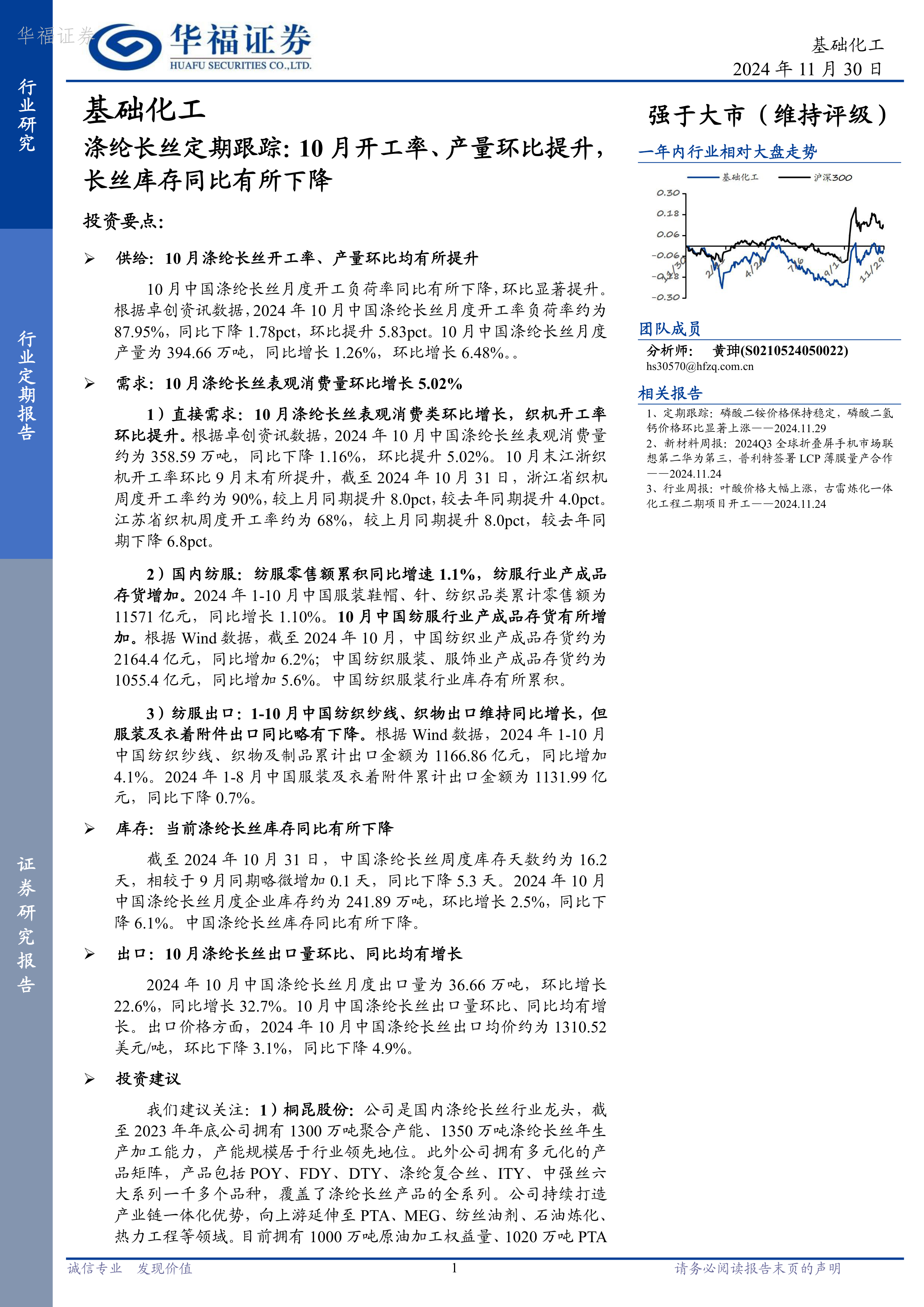 本报告的核心观点是:2024年10月,中国涤纶长丝行业供需状况有所改善,开工率和产量环比提升,库存同比下降,出口量同比环比增长。但纺织服装行业整体零售额增速缓慢,库存有所累积,出口方面也存在分化。华福证券维持对基础化工行业的“强于大市”评级,并推荐桐昆股份和新凤鸣两家公司。