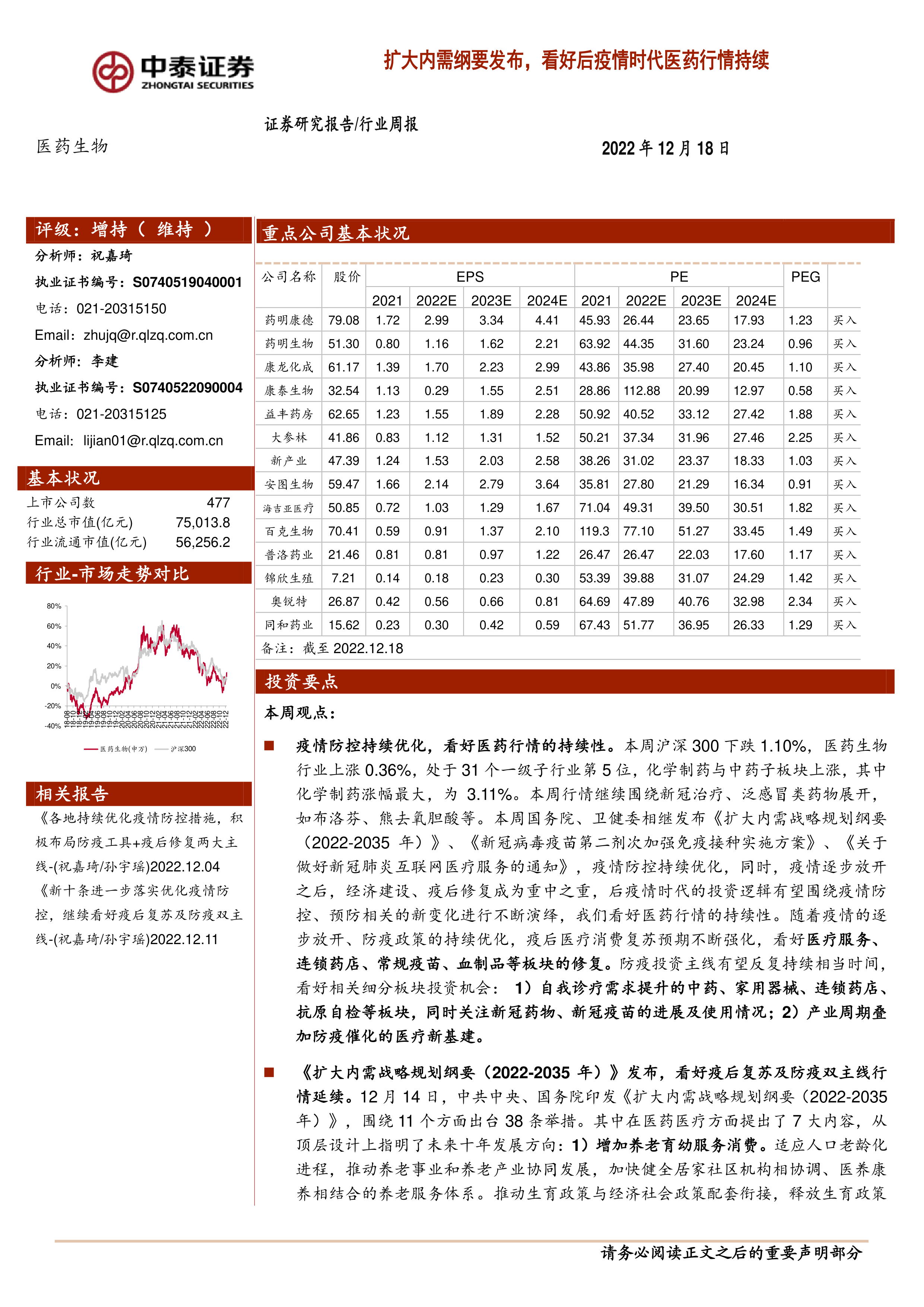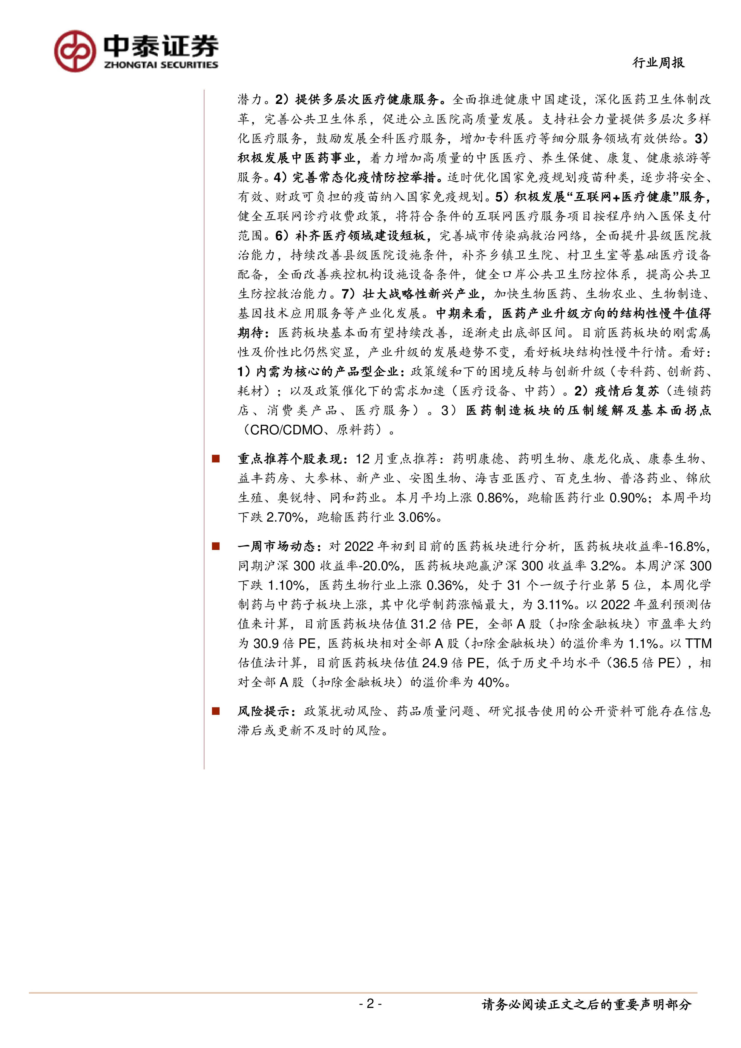 《扩大内需战略规划纲要(2022-2035 年)》发布,看好疫后复苏及防疫双主线行情延续。 12 月 14 日,中共中央、国务院印发《扩大内需战略规划纲要(2022-2035年)》,围绕 11 个方面出台 38 条举措。其中在医药医疗方面提出了 7 大内容,从顶层设计上指明了未来十年发展方向: 1)增加养老育幼服务消费。 适应人口老龄化进程,推动养老事业和养老产业协同发展,加快健全居家社区机构相协调、医养康养相结合的养老服务体系。推动生育政策与经济社会政策配套衔接,释放生育政策潜力。 2)提供多层次医疗健康服务。 全面推进健康中国建设,深化医药卫生体制改革,完善公共卫生体系,促进公立医院高质量发展。支持社会力量提供多层次多样化医疗服务,鼓励发展全科医疗服务,增加专科医疗等细分服务领域有效供给。 3)积极发展中医药事业, 着力增加高质量的中医医疗、养生保健、康复、健康旅游等服务。 4)完善常态化疫情防控举措。 适时优化国家免疫规划疫苗种类,逐步将安全、有效、财政可负担的疫苗纳入国家免疫规划。 5)积极发展“互联网+医疗健康”服务,健全互联网诊疗收费政策,将符合条件的互联网医疗服务项目按程序纳入医保支付范围。 6)补齐医疗领域建设短板, 完善城市传染病救治网络,全面提升县级医院救治能力,持续改善县级医院设施条件,补齐乡镇卫生院、村卫生室等基础医疗设备配备,全面改善疾控机构设施设备条件,健全口岸公共卫生防控体系,提高公共卫生防控救治能力。 7)壮大战略性新兴产业, 加快生物医药、生物农业、生物制造、基因技术应用服务等产业化发展。 中期来看,医药产业升级方向的结构性慢牛值得期待: 医药板块基本面有望持续改善,逐渐走出底部区间。目前医药板块的刚需属性及价性比仍然突显,产业升级的发展趋势不变,看好板块结构性慢牛行情。看好:1)内需为核心的产品型企业: 政策缓和下的困境反转与创新升级(专科药、创新药、耗材);以及政策催化下的需求加速(医疗设备、中药)。 2)疫情后复苏(连锁药店、消费类产品、医疗服务)。 3) 医药制造板块的压制缓解及基本面拐点(CRO/CDMO、原料药)。