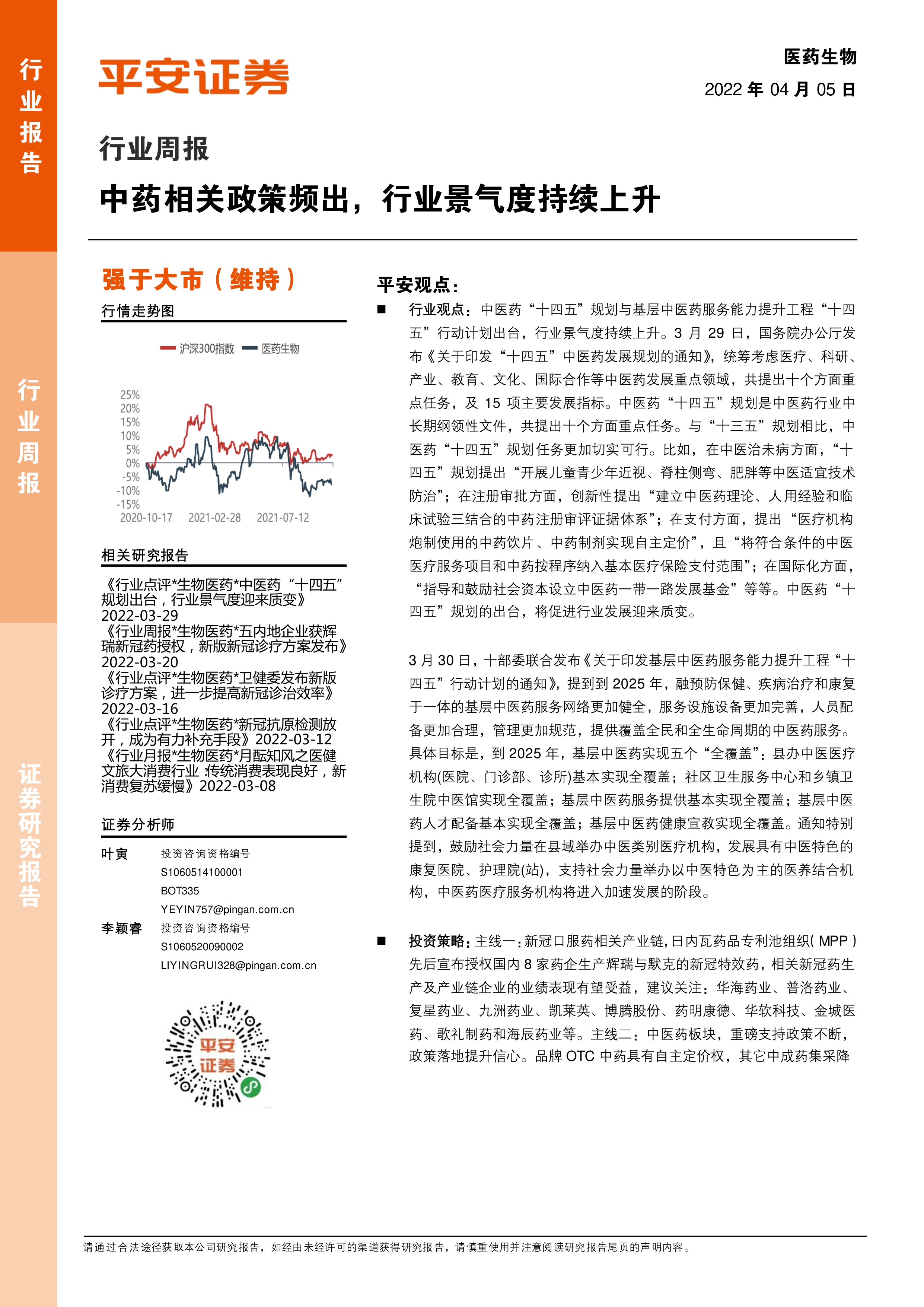 行业观点:中医药“十四五”规划与基层中医药服务能力提升工程“十四五”行动计划出台,行业景气度持续上升。3月29日,国务院办公厅发布《关于印发“十四五”中医药发展规划的通知》,统筹考虑医疗、科研、产业、教育、文化、国际合作等中医药发展重点领域,共提出十个方面重点任务,及15项主要发展指标。中医药“十四五”规划是中医药行业中长期纲领性文件,共提出十个方面重点任务。与“十三五”规划相比,中医药“十四五”规划任务更加切实可行。比如,在中医治未病方面,“十四五”规划提出“开展儿童青少年近视、脊柱侧弯、肥胖等中医适宜技术防治”;在注册审批方面,创新性提出“建立中医药理论、人用经验和临床试验三结合的中药注册审评证据体系”;在支付方面,提出“医疗机构炮制使用的中药饮片、中药制剂实现自主定价”,且“将符合条件的中医医疗服务项目和中药按程序纳入基本医疗保险支付范围”;在国际化方面,“指导和鼓励社会资本设立中医药一带一路发展基金”等等。中医药“十四五”规划的出台,将促进行业发展迎来质变。