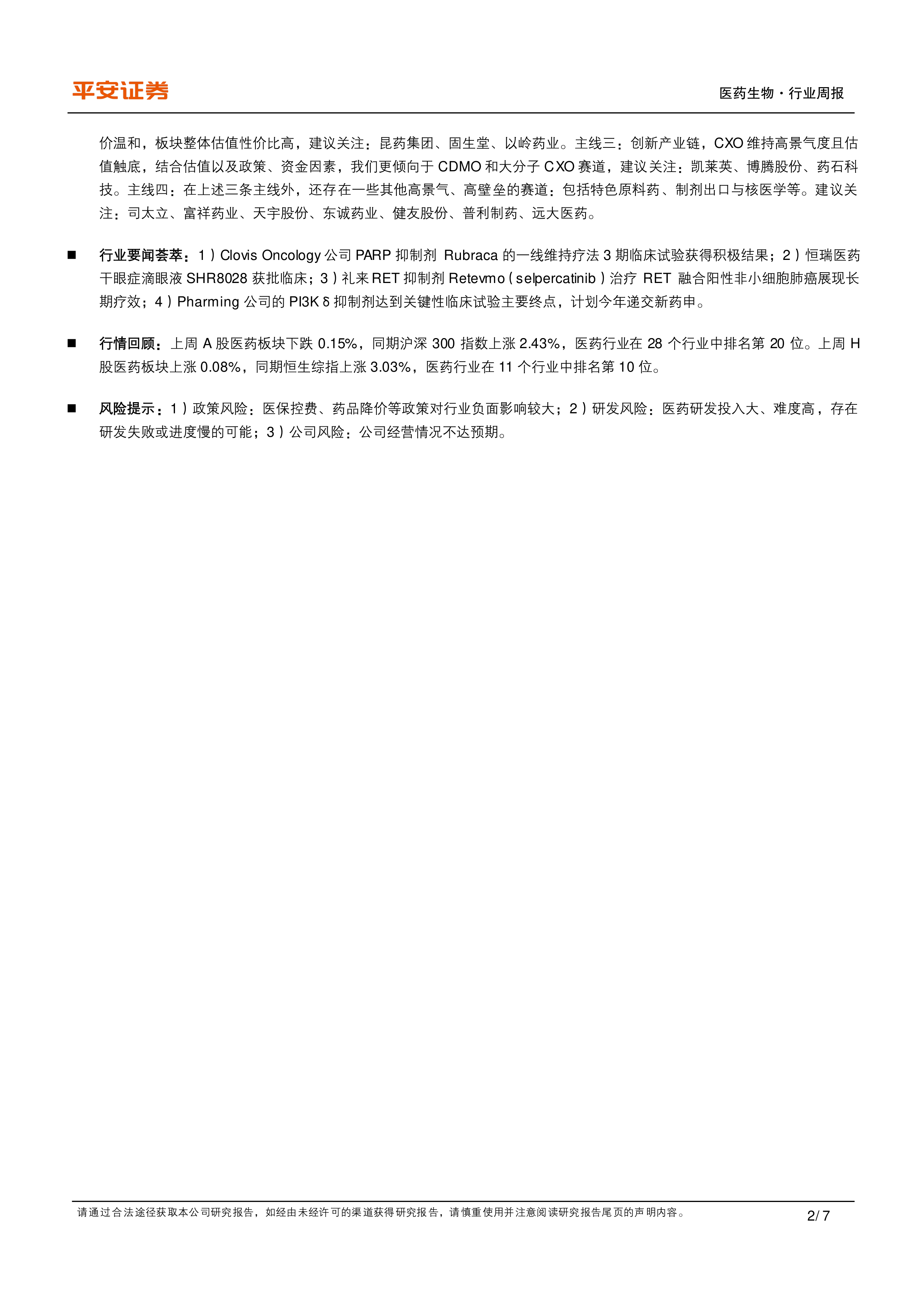 报告同样分析了上周H股医药板块的行情,指出其上涨0.08%,跑输同期恒生综指。报告也提供了H股医药板块整体估值以及各子行业的表现数据。