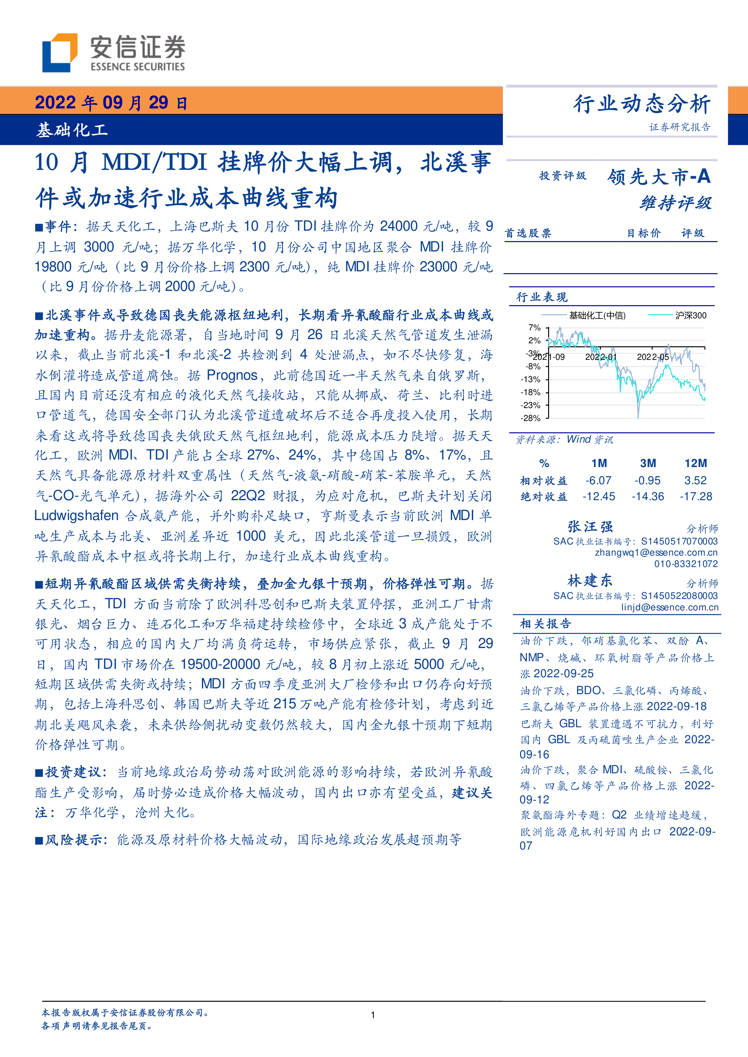 基础化工:10月MDI/TDI挂牌价大幅上调,北溪事件或加速行业成本曲线重构