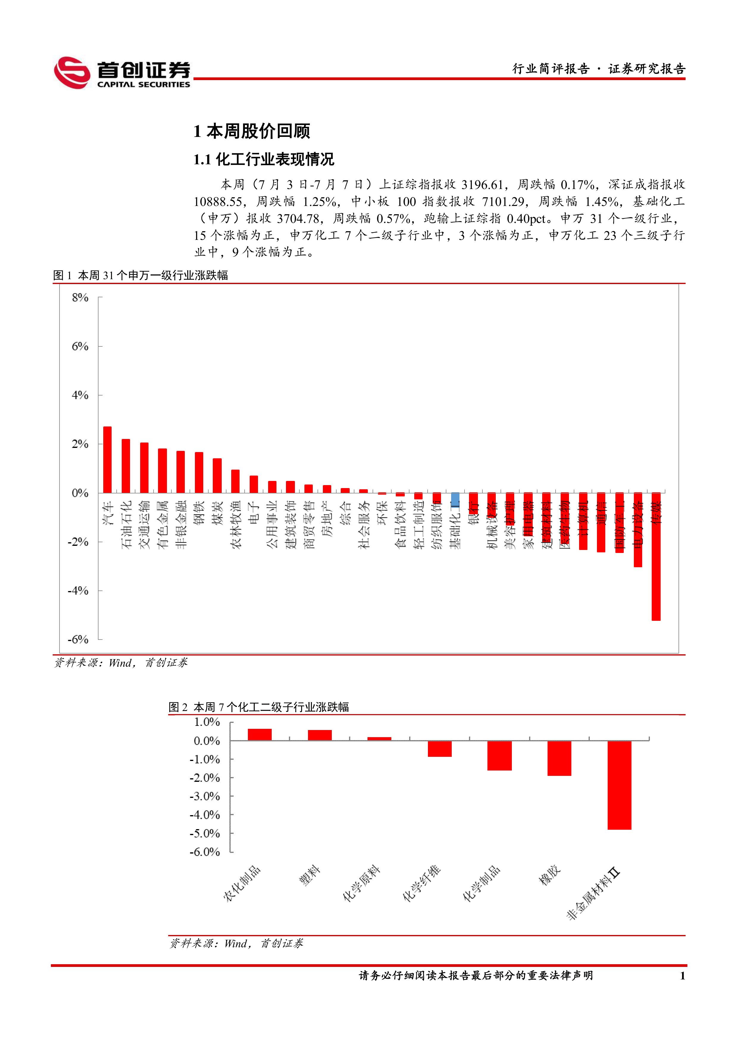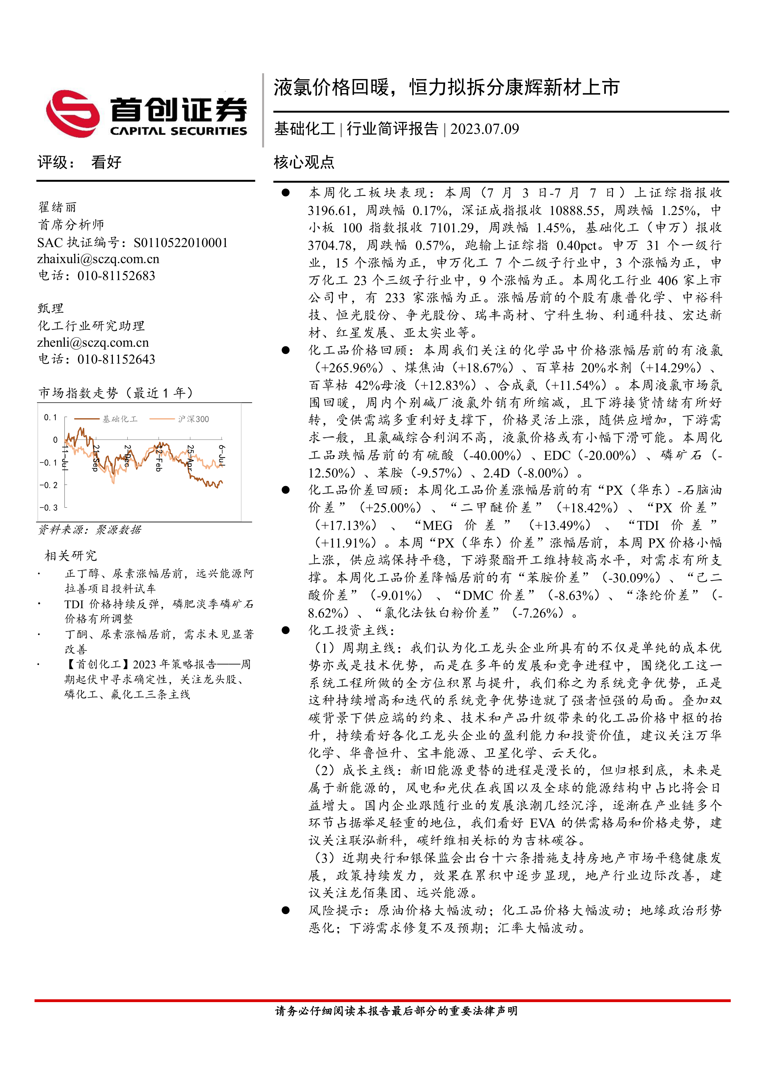 本报告基于首创证券于2023年7月9日发布的《基础化工行业简评报告》,对2023年7月3日至7月7日一周内中国化工行业市场表现进行数据分析,核心观点如下: