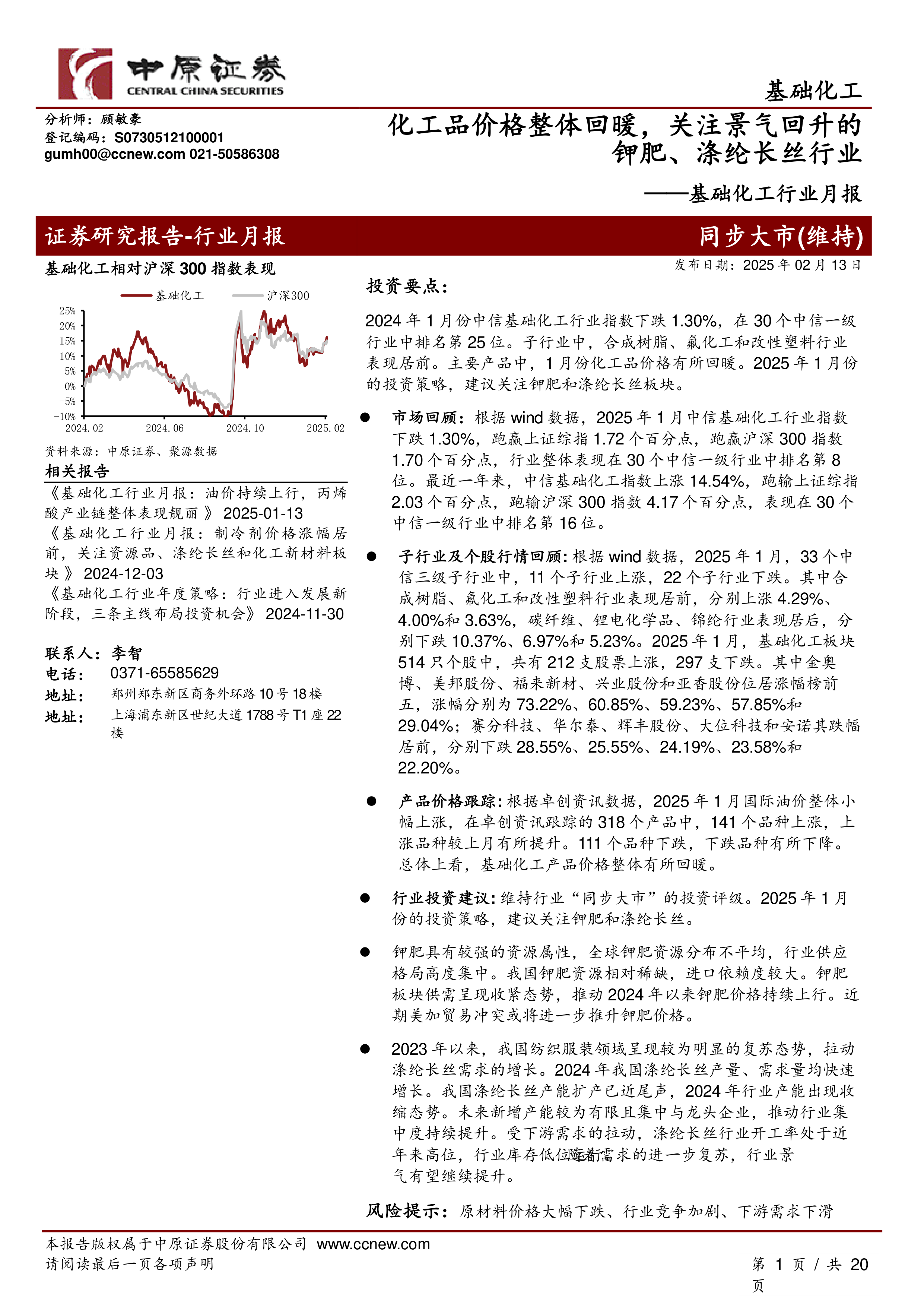 本报告对2025年1月份基础化工行业进行了全面的分析,涵盖了市场回顾、行业新闻、产品价格跟踪以及投资建议等方面。报告指出,尽管1月份基础化工行业整体表现略逊于大盘,但化工品价格整体回暖,部分子行业和个股表现强劲。 钾肥和涤纶长丝行业由于供需格局的改善,被认为是值得关注的投资方向。 然而,投资者仍需关注原材料价格波动、行业竞争加剧以及下游需求变化等风险因素。