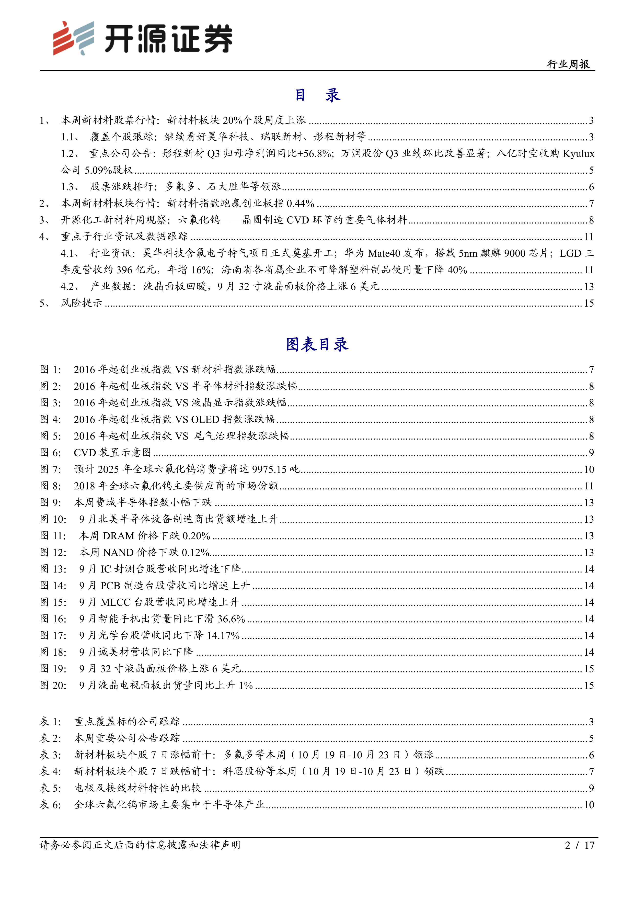 截至本周五(10 月 23 日),上证综指收于 3278 点,较上周五(10 月 16 日)的3336.36 点下跌 1.75%;创业板指报 2600.84 点,较上周五下跌 4.54%。新材料指数报 3223.64 点,较上周五下跌 4.1%,跑赢创业板指 0.44%;半导体材料指数报1671.08 点,较上周五下跌 4.47%,跑赢创业板指 0.07%;液晶显示指数报 10170.04点,较上周五下跌 2.78%,跑赢创业板指 1.76%; OLED 指数报 2774.96 点,较上周五下跌 3.32%,跑赢创业板指 1.22%;尾气治理指数报 1983.69 点,较上周五下跌 5.55%,跑输创业板指 1.02%。