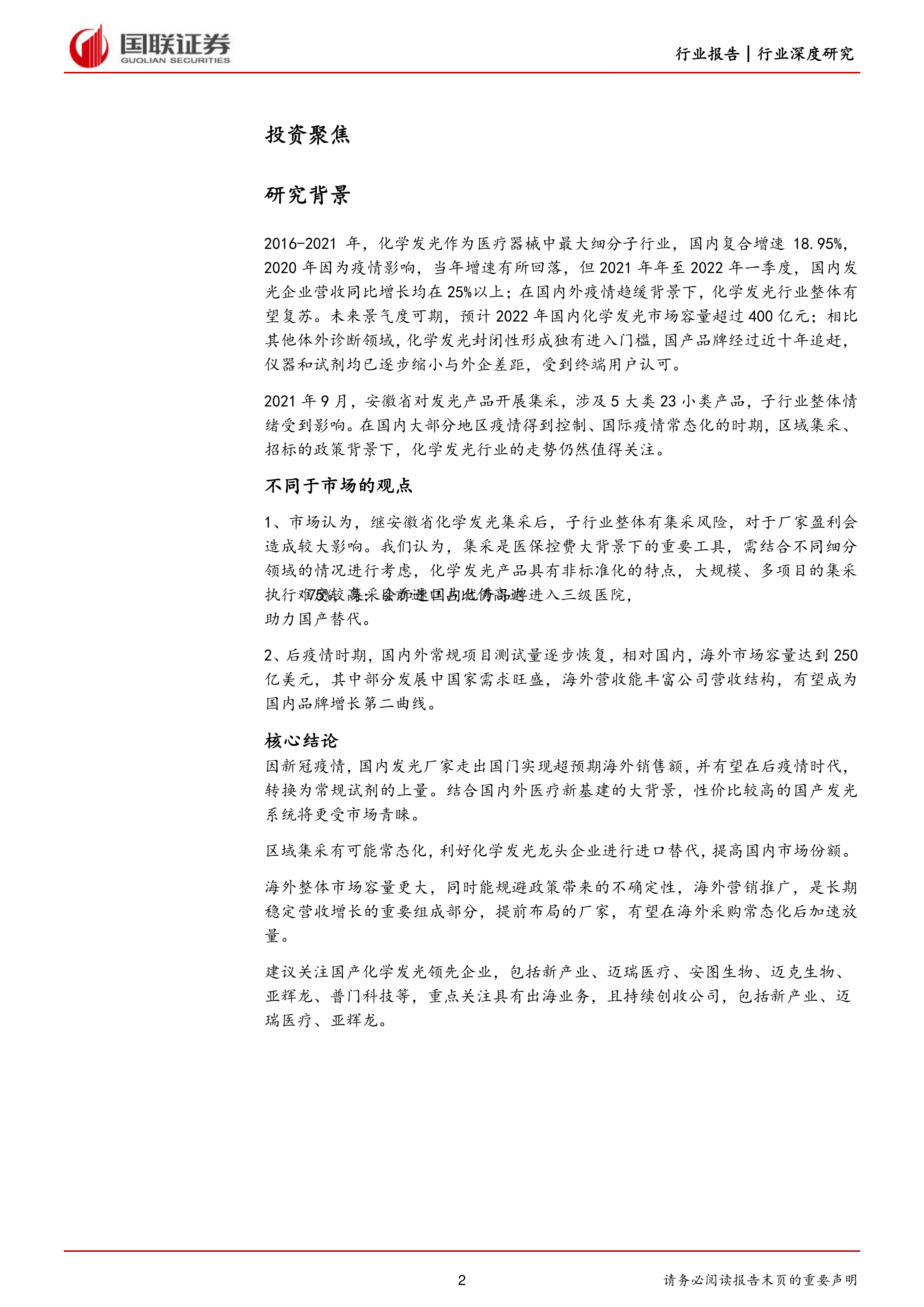 本报告的核心观点是:中国化学发光行业市场规模巨大,国产替代持续推进,并有望通过出海开拓第二增长曲线。报告详细分析了行业现状、发展趋势、竞争格局以及重点企业,并最终给出投资建议。