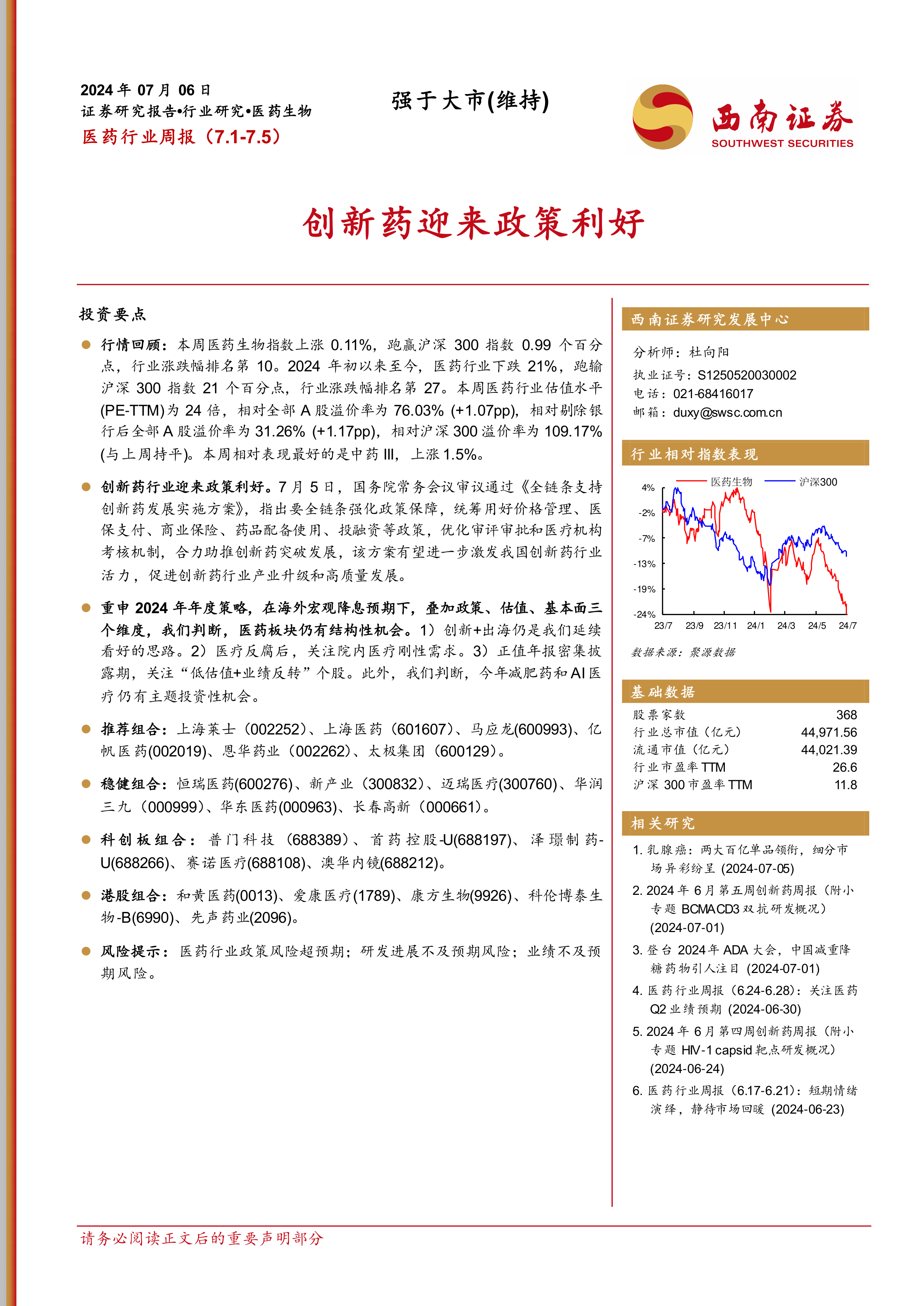 本报告涵盖医药行业周报(7.1-7.5)的多个方面,主要内容包括: