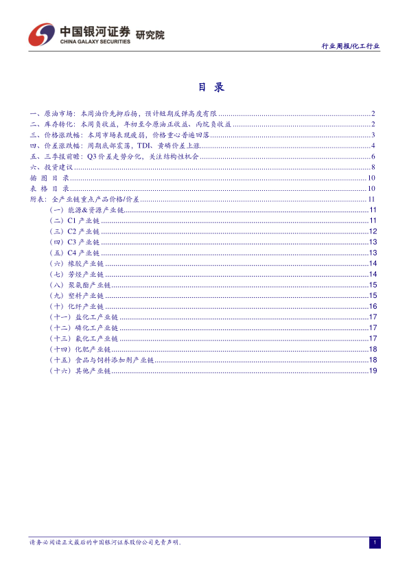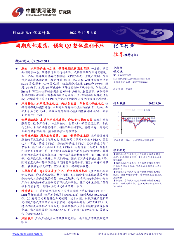 本报告的核心观点是:化工行业整体盈利在第三季度承压,但存在结构性机会。原油价格短期内反弹高度有限,需求端主导油价走势。化工产品价格重心回落,但TDI和黄磷等产品价差上涨,展现结构性行情。建议关注受益于欧洲天然气供应紧张、国产替代以及产业链整合的企业。
