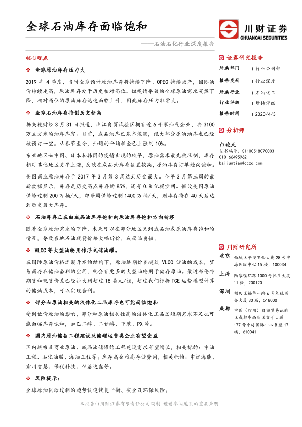 本报告的核心观点是:全球石油库存面临严重饱和风险,这主要源于新冠疫情导致的全球原油需求骤降,叠加此前相对高位的原油库存,导致库存压力急剧增大。这种压力正在从成品油库存饱和向原油库存饱和转移,部分地区甚至可能出现石油现货价格大幅折价或负值的情况。 同时,报告指出,大型油轮正被用作浮式储油罐,加剧了库存压力。 最后,报告建议关注国内原油储备工程建设及储罐运营类企业,并提示了全球原油供给过剩快速恢复平衡、安全及环保风险等潜在风险。